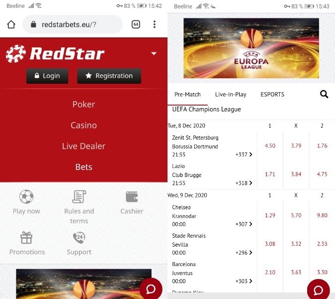 Регистрироваться и делать ставки в Redstar можно не только с компьютера, но и с помощью мобильных устройств. Чтобы попасть на мобильную версию сайта Redstar, откройте браузер на телефоне и введите в адресной строке redstarbets.eu. Функционал мобильной версии сопоставим с десктопным сайтом. Здесь также можно пройти регистрацию, прочитать правила букмекера и связаться с техподдержкой. В разделе «Покер» можно скачать мобильное приложение для игры в покер.