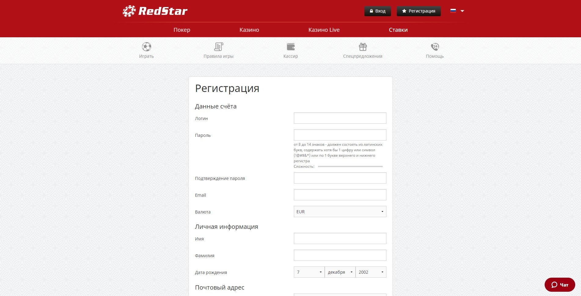 Завести аккаунт в букмекерской конторе Redstar могут жители более чем 240 стран и территорий. Для начала нужно нажать кнопку «Регистрация» в правом верхнем углу на главной странице redstarbets.eu. Далее посетитель увидит анкету, в которой нужно указать: