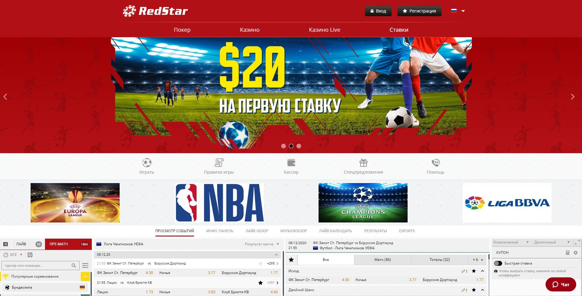 Пользователи «Редстар» могут делать ставки на спорт, киберспортивные матчи, события из мира шоу-бизнеса и политики. Также на сайте представлены отдельные вкладки «Покер», «Казино» и «Казино Live».