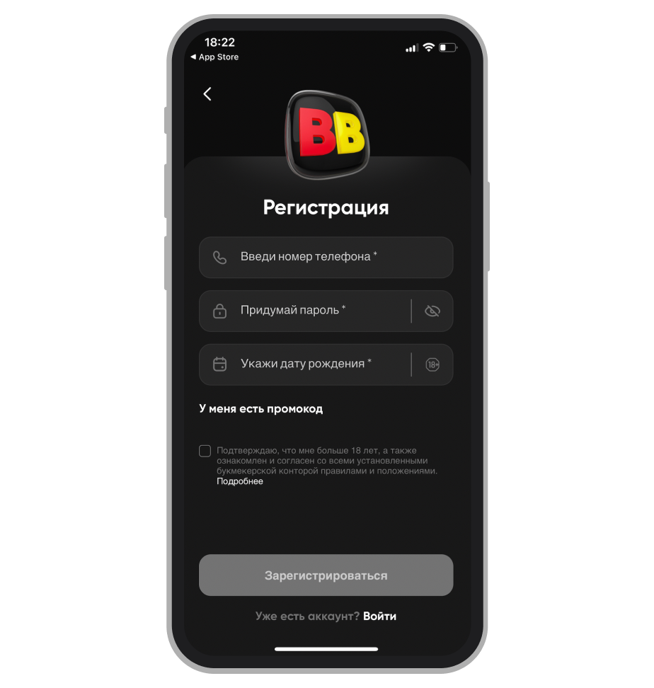 Открываем программу и создаём учётную запись в букмекерской конторе — для этого необходимо указать актуальные личные данные, подтвердить номер телефона, согласиться с правилами БК, пройти идентификацию и забрать приветственный бонус.