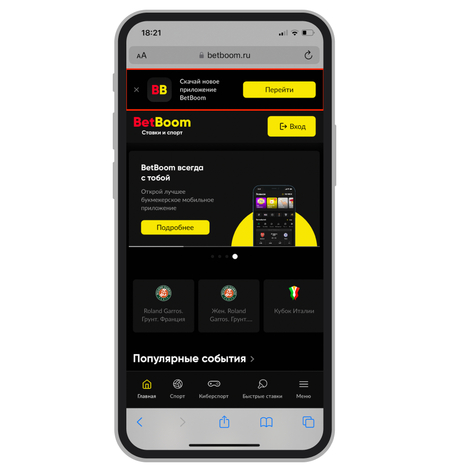 Заходим на сайт букмекерской конторы через браузер мобильного телефона и тапаем на ссылку с приложением. Обычно предложение скачать программу появляется во всплывающем окне, а также ссылку на неё можно найти внизу главной страницы.