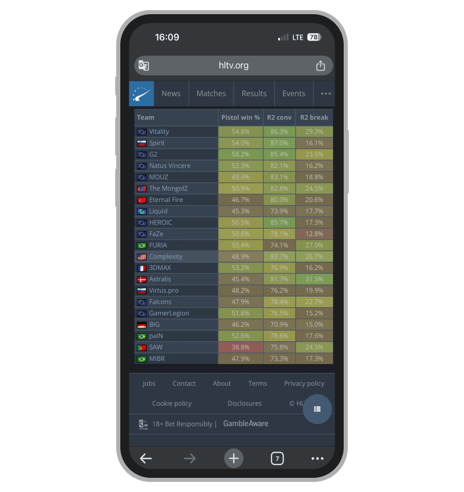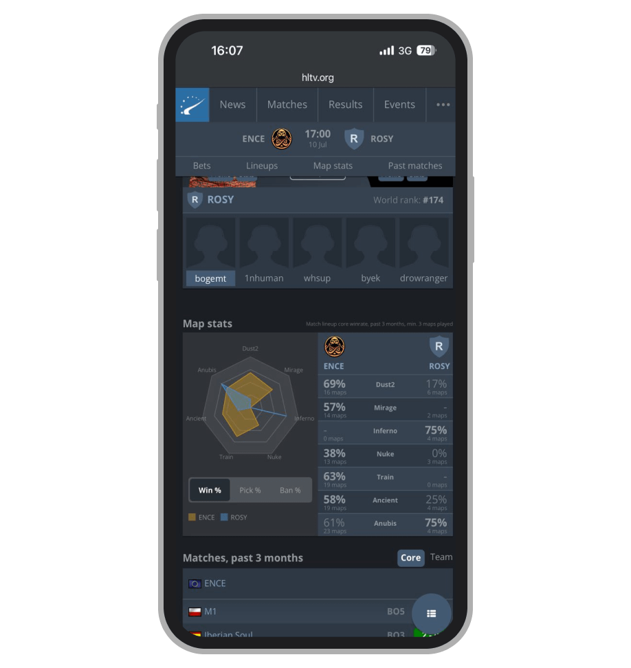 На сайте удобный раздел статистики: очные встречи команд, результаты последних шести встреч, процент побед на карте, статистика игроков по фрагам за раунд.