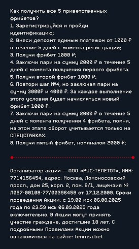 ❗️Да, в БК «Тенниси» доступна акция с фрибетами для новых игроков. После первого пополнения счёта и выполнения заданий по сумме пари, игрок получает серию бесплатных ставок.