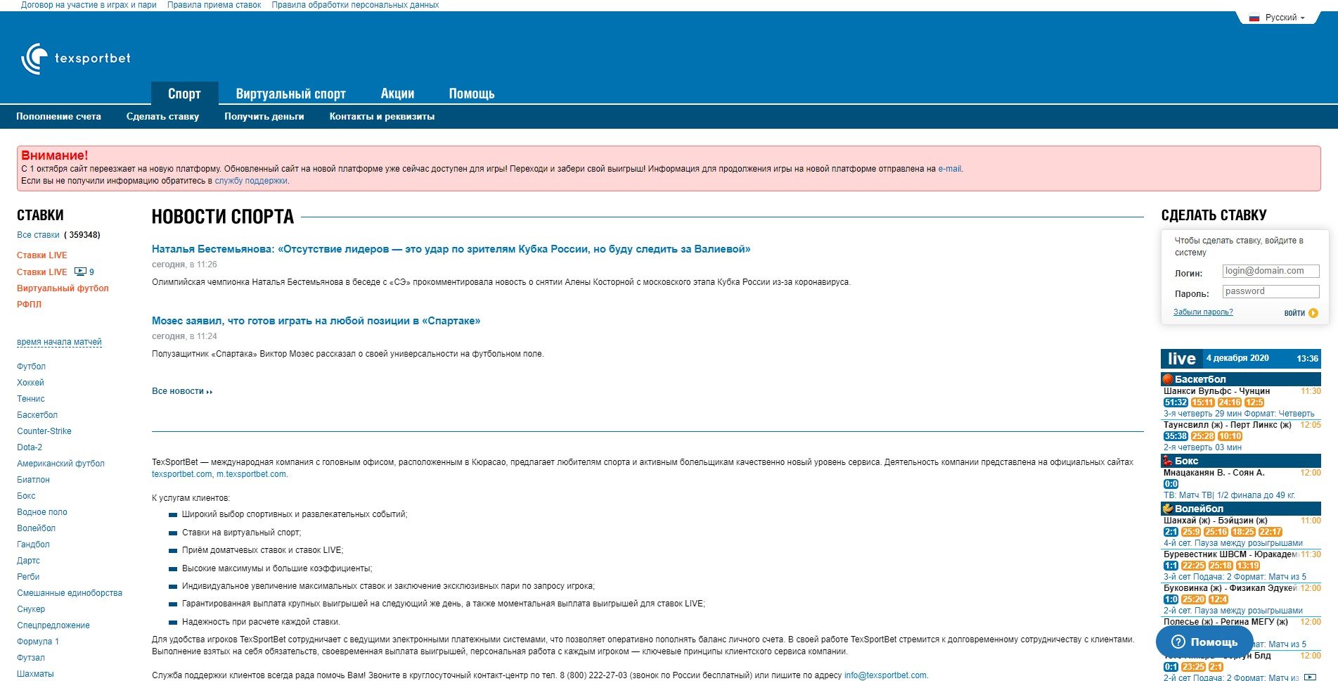 Контора принимает ставки только онлайн, сайт компании texsportbet.com доступен в двух языковых версиях — русской и английской. Также есть русскоязычная служба поддержки.
