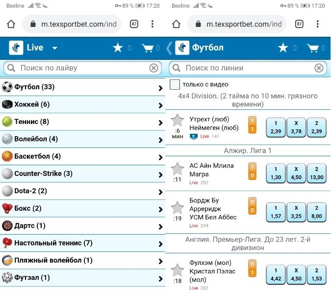 Пользователи БК Texsportbet могут делать ставки не только на компьютере, но и при помощи мобильных устройств. Зайдите в приложение браузер на телефоне и введите в адресной строке m.texsportbet.com. Мобильная версия имеет несколько усеченный вид. Здесь нет возможности попасть на вкладку «Акции», делать ставки в разделе «Виртуальный спорт», просматривать видеотрансляции и узнавать подробную информацию о букмекере.