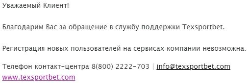 в специальной форме на сайте БК Texsportbet. Ответ поступит на указанный e-mail;