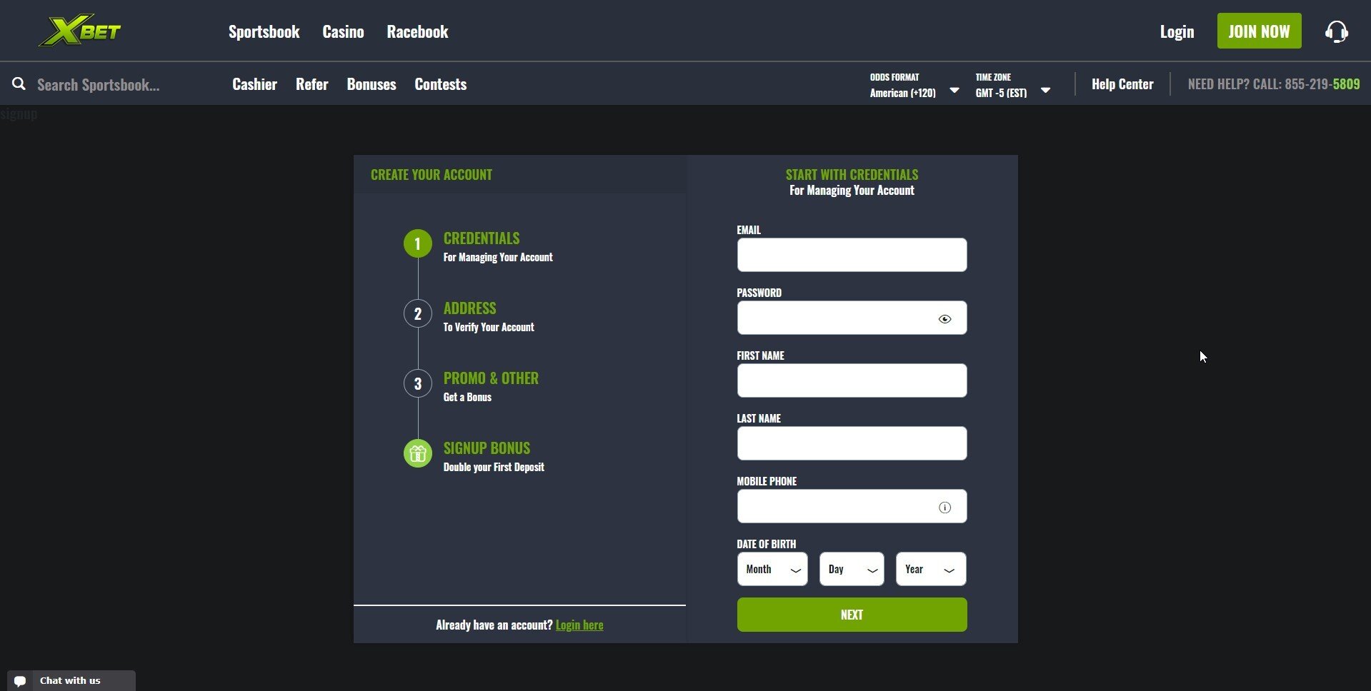 Для регистрации в Xbet нужно нажать кнопку «Join now» в правом верхнем углу главной страницы. Процесс создания нового аккаунта ничем не отличается от регистрации в других букмекерских конторах. На экране появится анкета, в которой нужно указать: