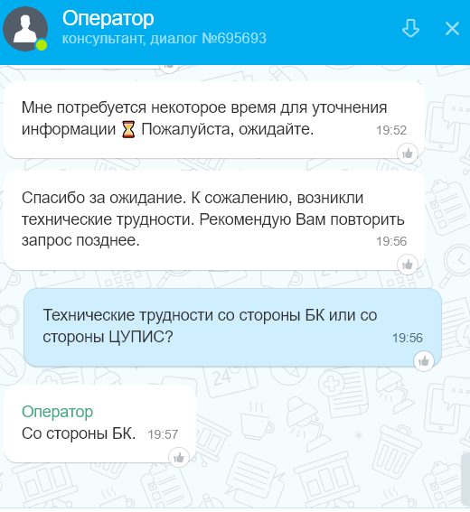Классика от БК Зенит. В этот раз там возникли "технические неполадки". При этом оператор колл-центра говорит, что дело в ЦУПИС, а оператор чата -- что дело в БК. Это цирк с конями, который кончится блокировкой и бессрочным рассмотрением как и во всех предыдущих случаях. Просто чудовищная контора. Причем согласно информации из колл-центра: "Верификация пройдена, ограничений нет".