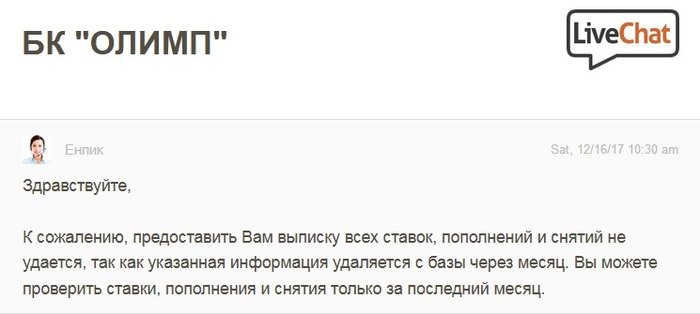 Я не нашел в правилах Олимпа пункта, согласно которому они удаляют всю информацию по ставкам и пополнениям спустя месяц. В переписке также мне не сообщали о таком пункте правил. Может я проглядел и Вы подскажите номер этого пункта?
