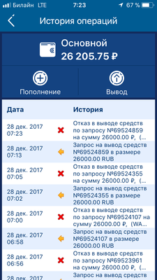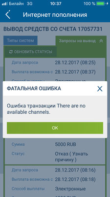 22. 12. 2017г. попытался вывести денежные средства в размере 13 300 рублей на киви кошелек. Запрос создал, жду одобрения от оператора. Все одобрено, перехожу по ссылке и мне выдает "ФАТАЛЬНАЯ ОШИБКА. Ошибка транзакции There ara no available channels. Жму узнать причину, пишут отказ оператора (Нет доступных каналов). ночью с горе попалам вывел 6000 рублей за три запроса. Остальные не получается вывести. Выдает одну и тужу ошибку.В службе поддержке ничего внятного ничего не говорят, кроме как, ждите разбираются специалисты. Помогите решить данною проблему