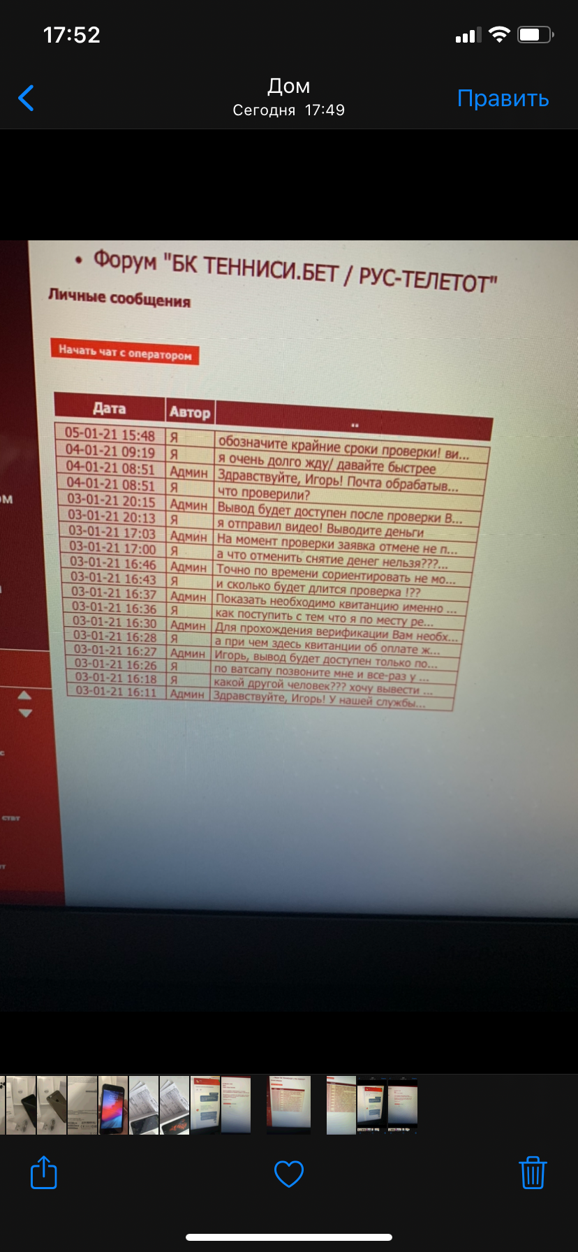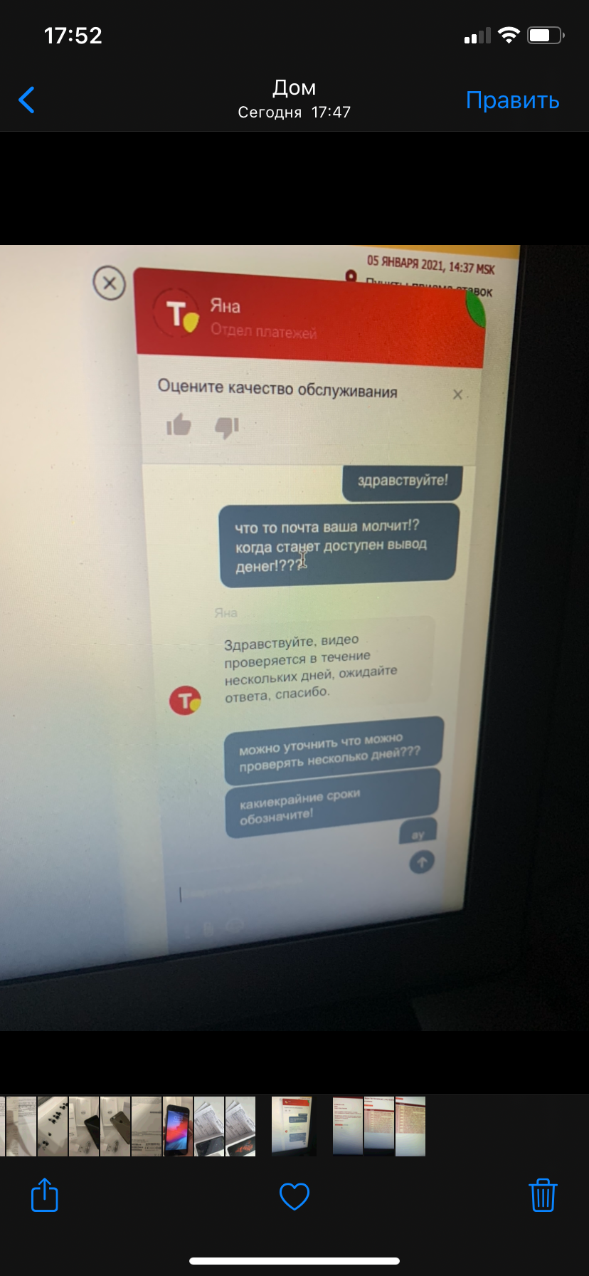 При попытке снять выигрыш получил данное сообщение! Клиент: Игорь Николаев Сообщение:Здравствуйте, Игорь! У нашей службы безопасности появились опасения, что счетом может управлять другой человек, что категорически запрещено. Чтобы снимать деньги Вам следует предоставить подтверждение того, что зарегистрированный счет принадлежит именно тому, чье имя указано в регистрационных данных. Для этого Вам необходимо снять короткий видеоролик, в котором выполнены следующие условия: - ясно виден хозяин паспорта и сам паспорт, открытый на странице с фотографией; - Вы демонстрируете оплаченную (с печатью банка) квитанцию за коммунальные платежи (ЕПД) сроком не старше двух месяцев, на которой видны ваши ФИО и адрес проживания; - на мониторе в браузере открытый счет на нашем сайте с этим сообщением на экране; - выполнена программа cmd, в которой выполнена команда ipconfig /all или getmac. С тем, чтобы был виден уникальный MAC адрес компьютера; - браузер на Вашем компьютере той же версии, что и браузер с которого Вы обычно играете на нашем сайте; Данный ролик необходимо отправить на Мы приносим Вам извинения за возможные неудобства. В свою очередь информируем, что данная процедура выполняется один раз. Спасибо за понимание! отправил все что они хотят! В итоге деньги упали обратно в бк но не на карту! Играть не возможно установили лимит 0 кэфы упали! Говорят что после прохождения проверки моих документов станет доступен вывод! А сколько они будут проверять документы не говорят! Да и что там проверять?! Ужас зависло 109900 РУБЛЕЙ!!!