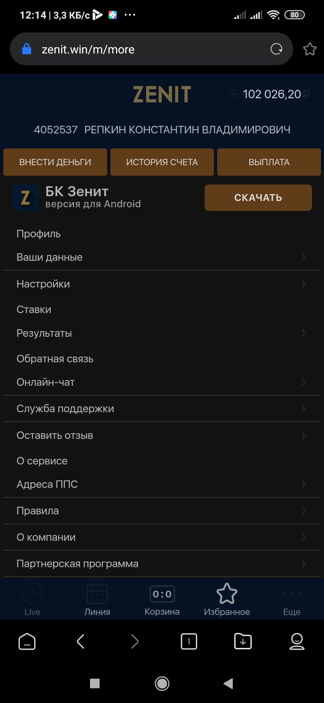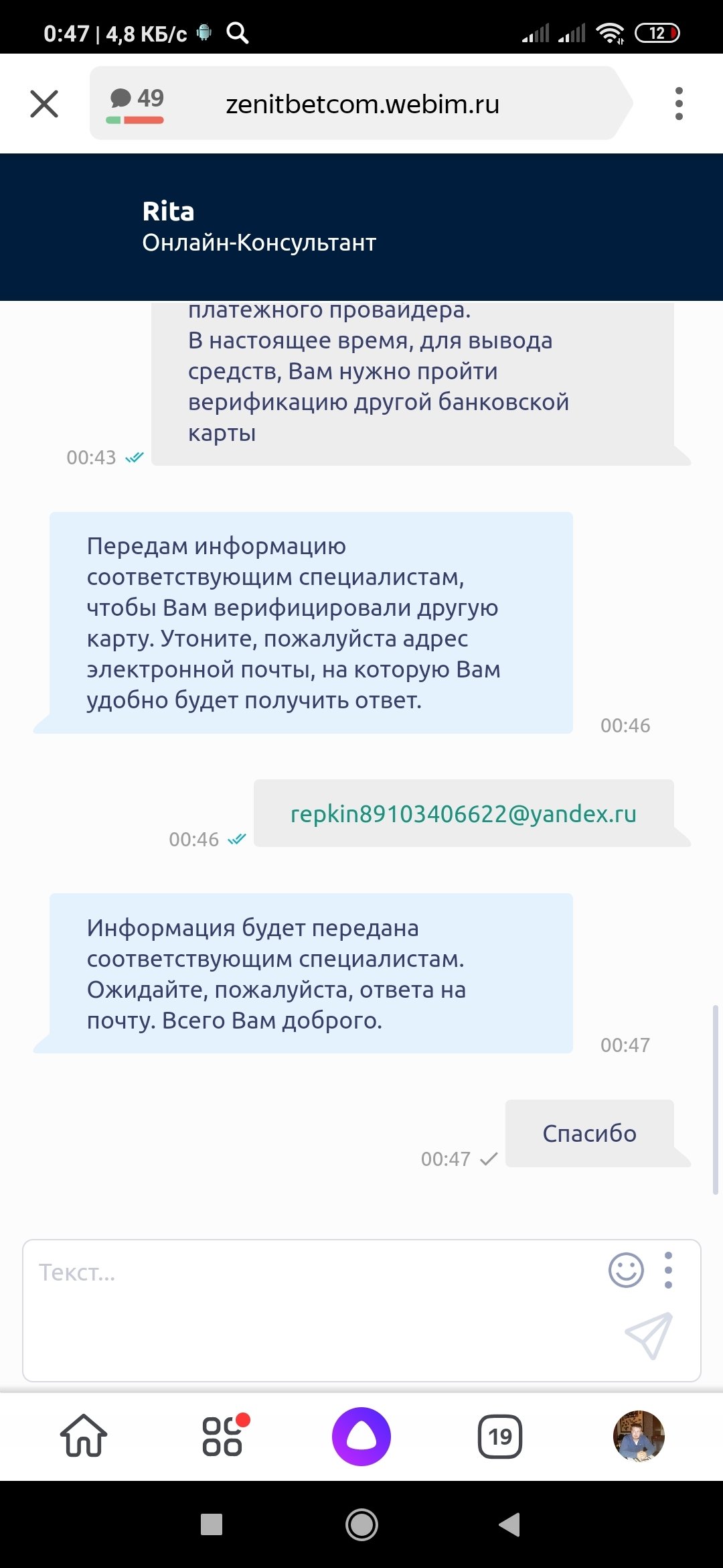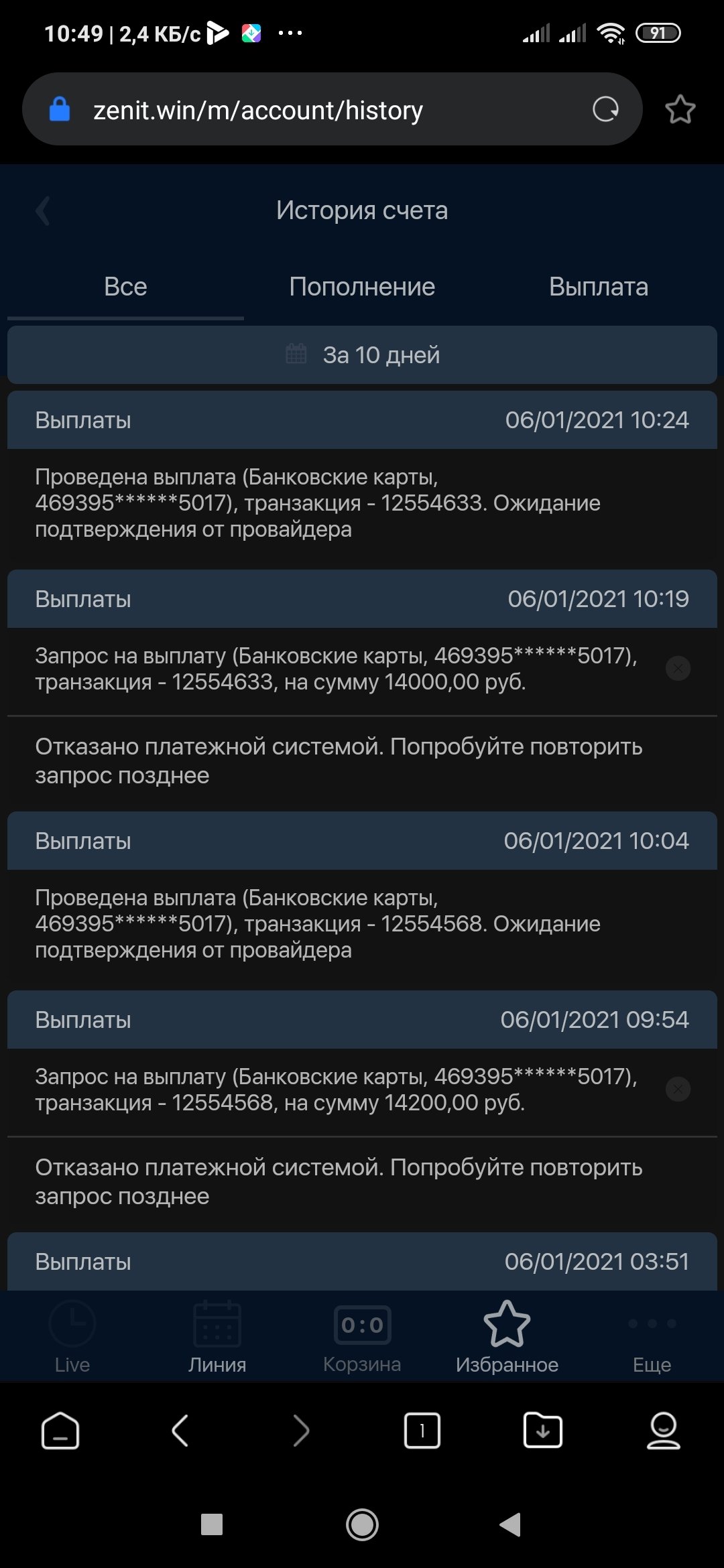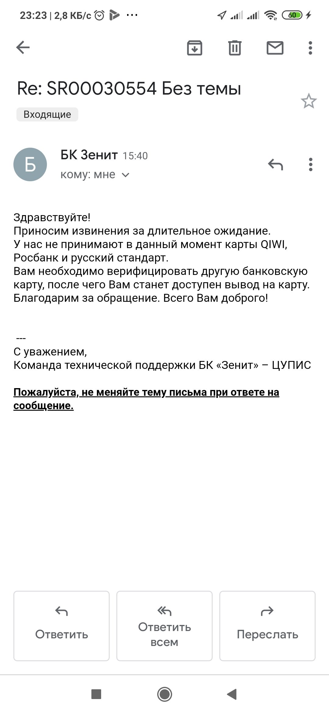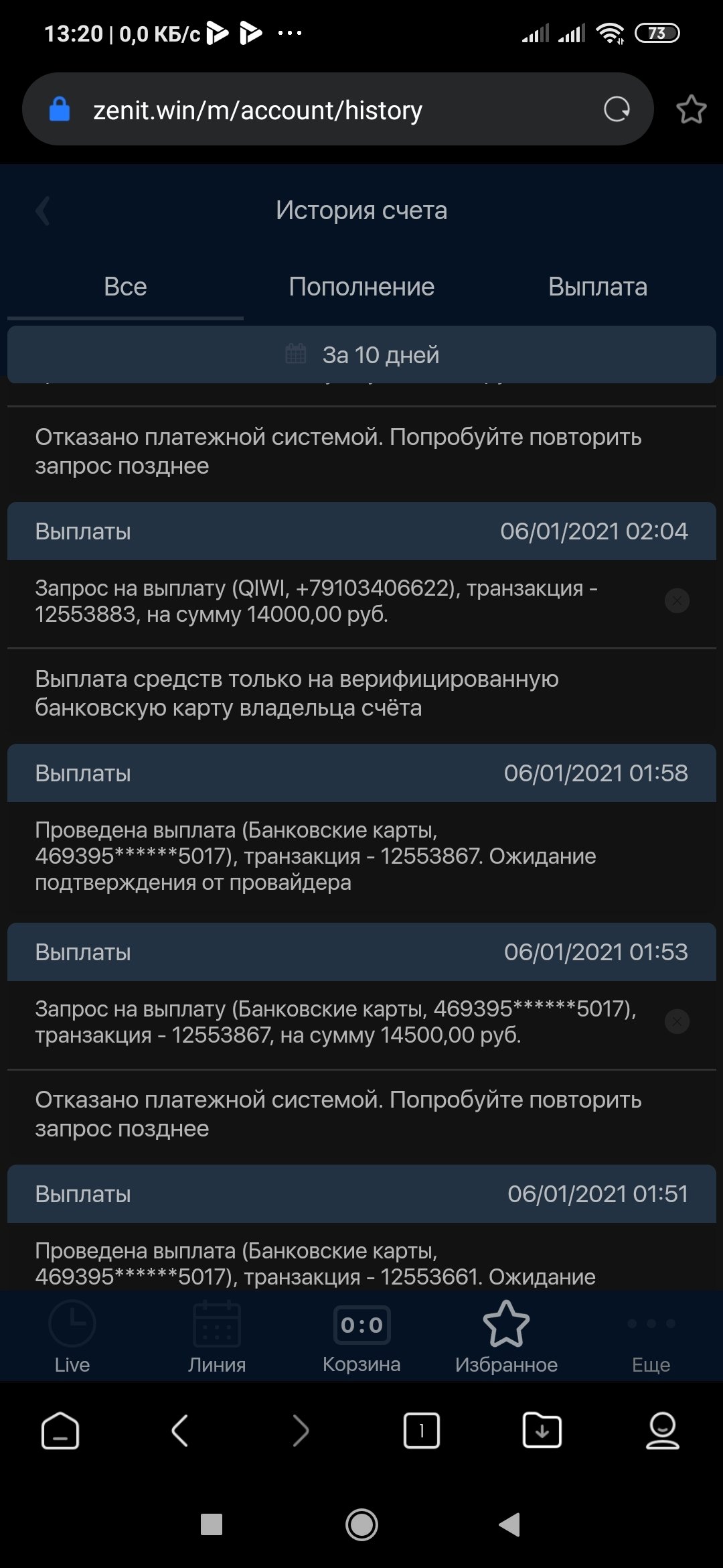 Зенит не выводит деньги,до верефикации выводились без проблем,а сейчас требуют на именную верефицированную карту,где при запросе на вывод постоянно отказ провайдера,уже 10 раз и запросы через час два не помогают,звонки и общение с сайтом не помогают