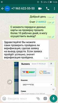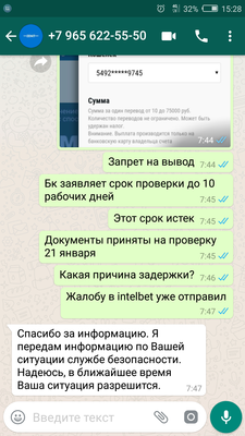 Номер счета 2144953. Бк не дает вывести средства со счета. Первый запрос на вывод был 17 января, после 48 часов было сообщено, что необходимо выводить на банковскую карту, а не на киви кошелек (хотя пополнение осуществлялись именно с киви!!!). Пополнил счет с карты на 10 р, чтобы она стала отображаться в вариантах вывода. Затем запросил вывод на банковскую карту. Через 28 часов снова отказ. Бк запросила фото карты на проверку. Отправил по почте. Срок провеку как заявила БК до 10 рабочих дней (данные приняты на верификацию 21 января) . Этот срок уже не закончился, но запрет на вывод до сих пор остался. На вопросы по эл.почте и whats'app служба поддержки ничего не отвечает. Все скриншоты вложил. Уважаемыя администрация intelbet, прошу Вас разобраться в этом вопросе.