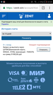В очередной раз рекомендую воздержаться от ставок в бк зенит. /blogs/136421/ - ознакомьтесь с материалами все, кто думает отркывать счет у этих мошенников.