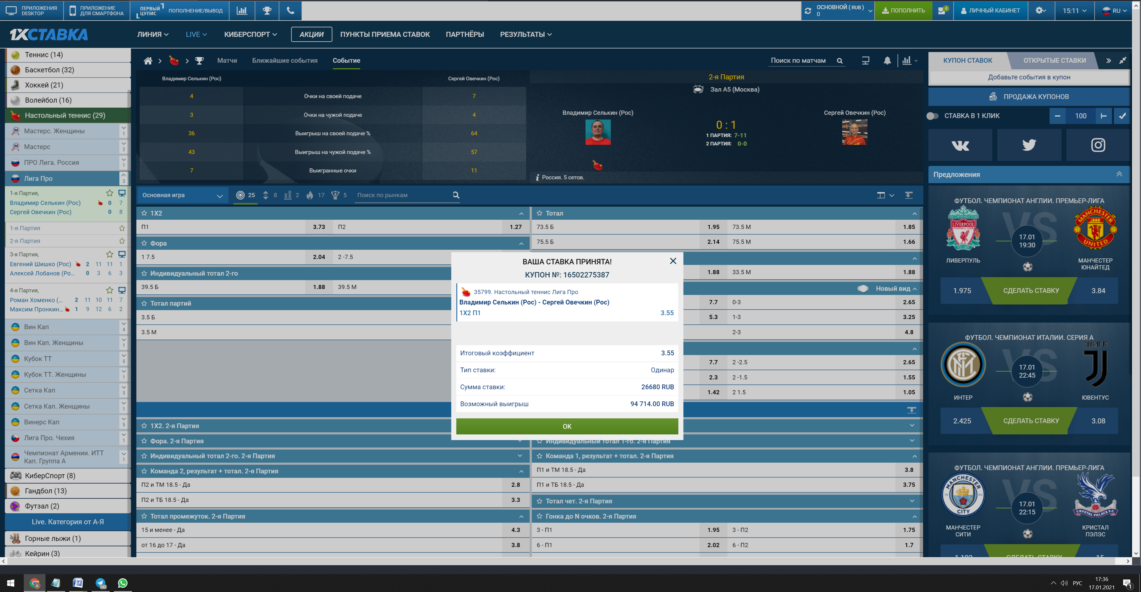 Здравствуйте. 17 января 2021 года сделал ставку в 1хставке купон №16502275387 Настольный теннис Лига ПРО Селькин - Овечкин 26680 на кф. П1. Ставка сыграла. Мне должны были выплатить 94714р. Но БК решил рассчитать ставку по кф 1.3 сославшись на неверный кф. В тоже время БК марафон например точно такую же ставку рассчитывает моему товарищу по кф без каких-либо неверных кф и т.д. Делаю вывод, что 1х решили просто зажать 60000 руб. которые они мне не доплатили. Все скриншоты прилагаю. Прошу вас помочь мне забрать у бк 1х мой выигрыш.