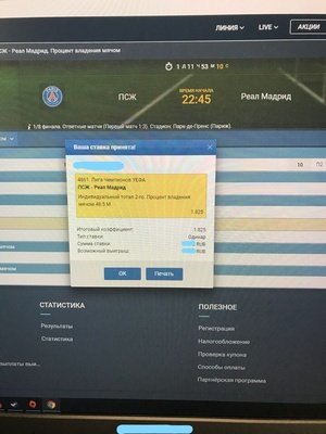 Номер купона: №2824910601 матч ПСЖ - Реал Мадрид