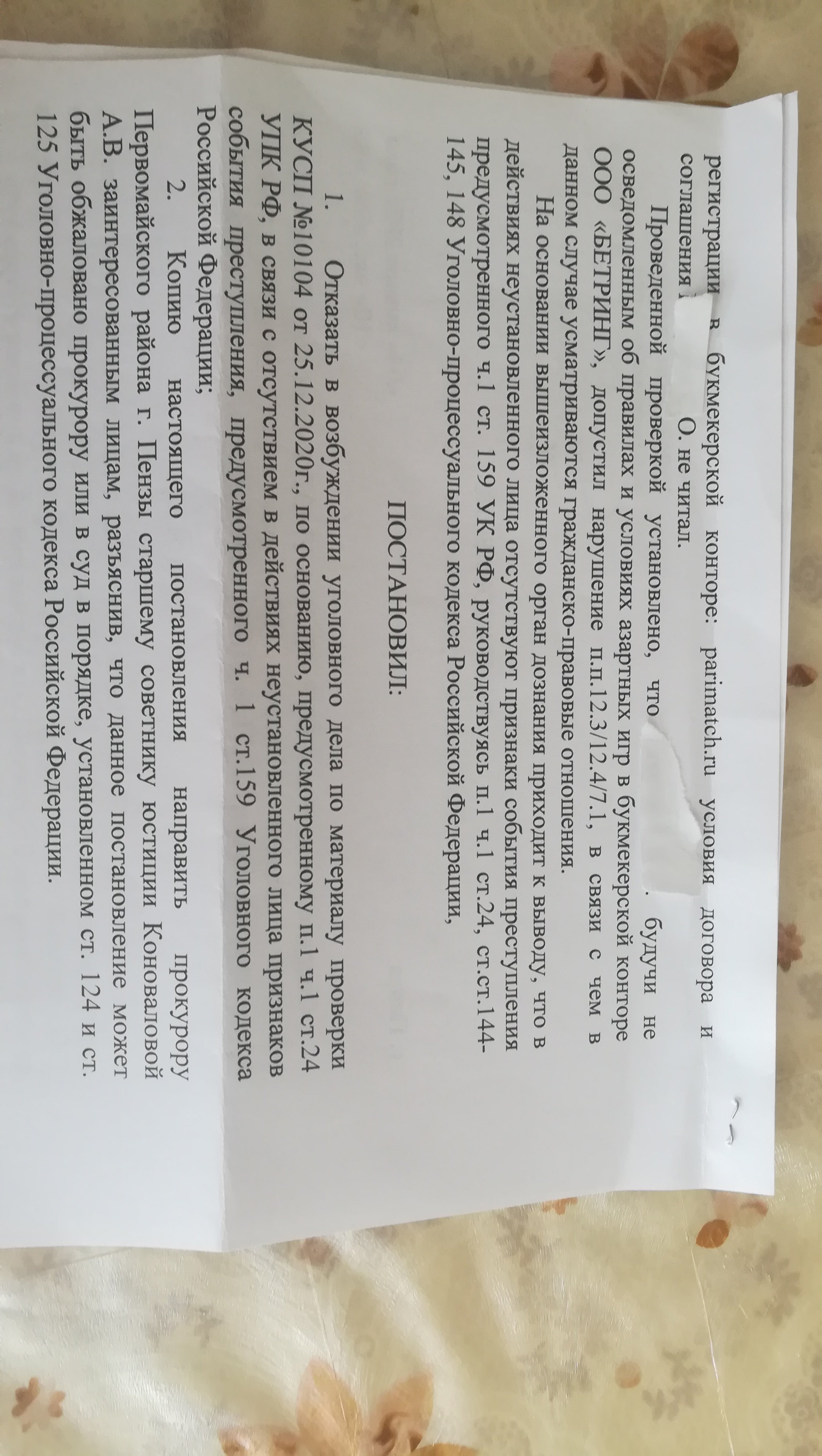 В общем начну по порядку. Создаю аккаунт 21 января, потому что знакомые ставят через пари и я решил тоже попробовать, в первый день особо не на, что было ставить и я начал смотреть какой-то непонятный хоккей 3х3 и в какой-то момент я понял, что комментатор часто угадывает победы команд видно, что он уже знает игроков, кто как и играет и тп. И я начал анализировать и записывать фаворитов и аутсайдеров, а поскольку каждый раз коэффициенты на всех были равные начал ставить. После первого дня уже понял, что не всегда это работает на аккаунте было +1500 рублей и я решил их вывести, вывод заблокировали. Я начал звонить, прошел верификацию, вывод не открывают. И я начал от скуки дальше ставить на этот хоккей плюс КХЛ и ВХЛ. В итоге 2 недели ожидания, а вывод средств по прежнему закрыт. И за эти 2 недели я успел выйти в плюс 74 тысячи с копейками. Я никогда в жизни столько не выигрывал и был очень рад этому. Потом мне названчали 3 этап верификации по скайпу, где какой-то человек буквально ДОПРАШИВАЛ меня о правилах хоккея и терминах в ставках, мне показалось это смешным, но ответил на все вопросы. Через день вижу списание средств в размере всех выигрышей по пунктам 12.3, 12.4, 7.1, В письме сказали, что это решение без объяснения причин, но якобы были недобросовестные ставки, Объяснить значение слова "недобросовестный" мне так же отказались. Никто не хочет ничего объяснять. Деньги, которые я заводил так же мне не отдают, они просто висят в вечном ожидании вывода. Я не знаю к кому обращаться и, что делать. Друзья советуют идти в суд и полицию с заявлением, но надеюсь мы сможем урегулировать это здесь! Заранее спасибо!