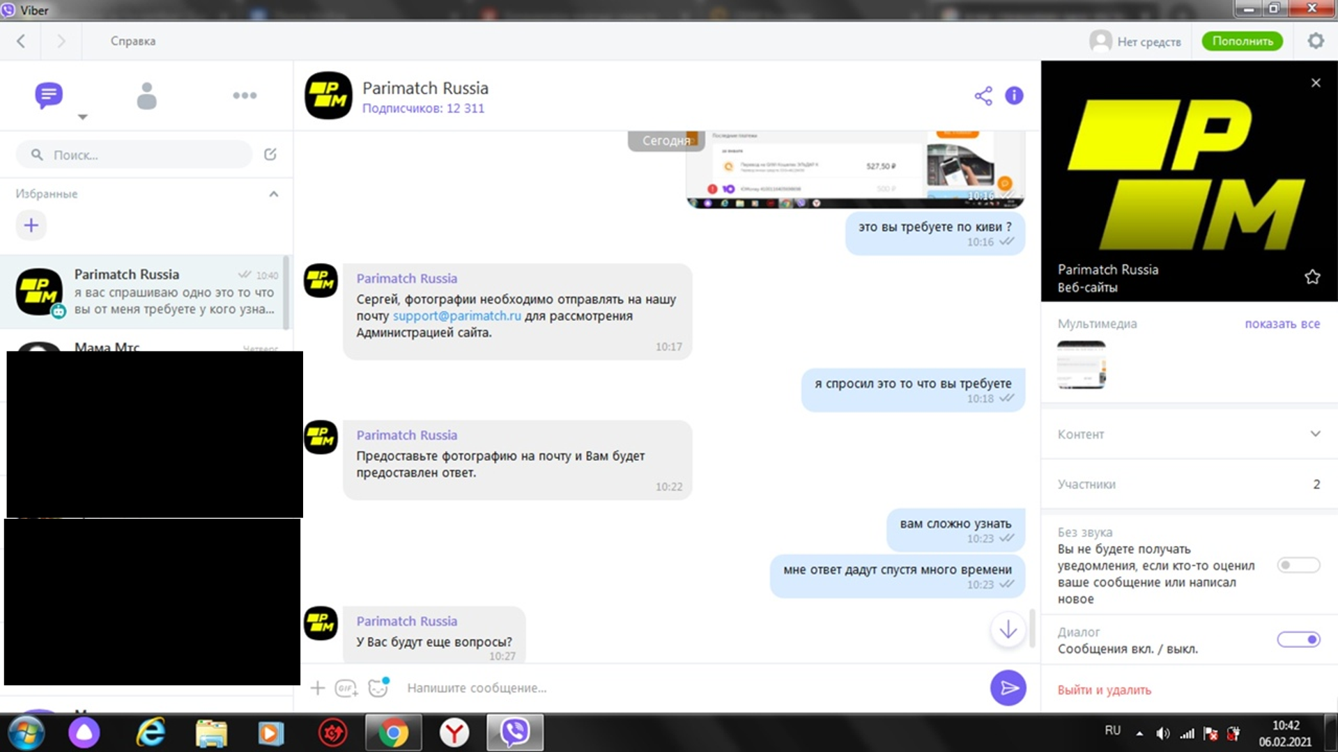 Добрый день , помогите решить проблему с париматчем , 22 январе внес на баланс 7т рублей , с них на данный момент выиграл больше 130т рублей но париматч ни в какую не хочет их отдавать , с 30 января вывод недоступен писал и звонил в тех поддержку говорят проводим проверку , никто не объясняет с чем связана тыкают только пунктами правил , на мои любые вопросы отвечают неконкретно все расплывчато похоже на мошеннические действия с их стороны , меня смущает одно когда был баланс минусовой не кому и дело не было до моей личности как только вышел в плюс сразу проверки и не возврат средств а в них очень нуждаюсь . Заранее спасибо Спустя 7 дней они мне говорят что проверка оказывается по подозрению в чем то , а не проверка личности и как им верить ? они просто не хотят отдавать деньги вот и все номер игрового счета 581036997
