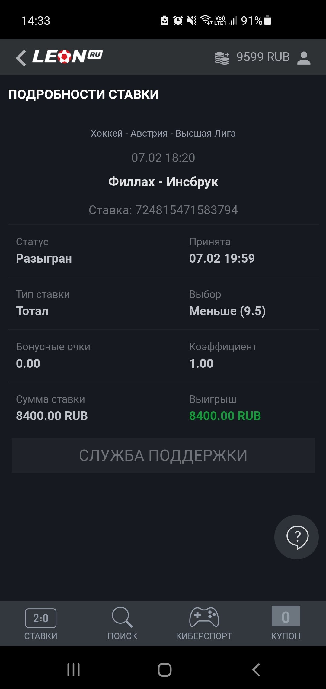 Здравствуйте! Поставил ставку на хоккей Филлах - Инсбрук Тотал меньше 9.5 (724815471583794) Ставка выиграла, зачислили выигрыш и всё хорошо. Потом видимо им показалось, что я слишком много выиграл и мне сделали возврат якобы это ошибка, хотя другие явно ошибочные ставки, но проигрышные они не возвращают! Явная политика двойных стандартов и мошенничество с их стороны.