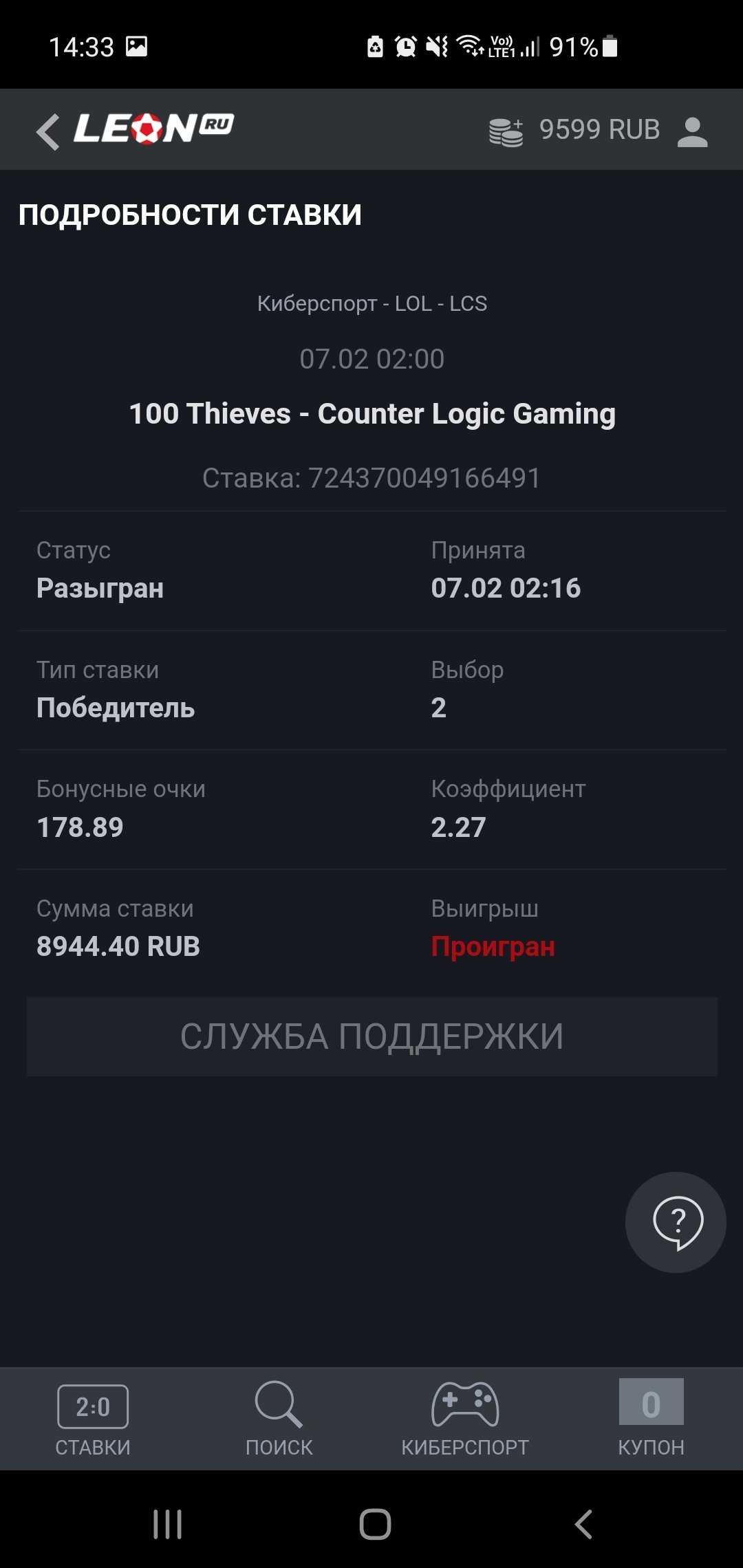 Двойная политика компании выигрышные ставки делают возврат (якобы ошибка), а проигрышные, где явная ошибка оставляют в проигрыше. Отменили одну выигрышную ставку, якобы это ошибка. А другую ставку, где были перепутаны коэффициенты на команды они не возвращают. Матч Киберспорт 02:16 LOL - LCS 100 Thieves - Counter Logic Gaming Поставил на П2, коэффициент и начал следить за матчем. Команда 2 выигрывала продолжительное время, но коэффициент на неё на леоне рос, а на команду 1 падал, когда должно было быть наоборот. На других БК это отображалось корректно, т.е. на выигрывающую команду 2 коэффициент падал, а не рос, как на леоне. Думал вернут ставку, как они делали обычно, но команда 2 по итогу проиграла и не смотря на то что, была ошибка в отображении коэффициентов относительно команд, никто не сделал возврат и они говорят, что всё корректно. Номер ставки724370049166491 Прошу посодействовать по справедливости, иначе придётся обращаться к юристам, писать досудебку и если даже так не произведут корректный расчёт, пойду в суд. Судьи очень охотно рассматривают дела в пользу клиентов БК.