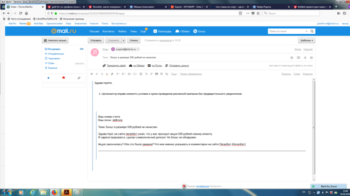 На Вашем сайте - Легалбет - увидел рекламную акцию от компании бетсити (далее по тексту: Г.). Так вот это Г. анонсировало бонус в размере 500 рублей каждому новому клиенту. Единственное условие для получения: депозит. Срок акции с 1 апреля по 31 декабря 2018 года. Я думал, что регистрации в конторе Г. не зйамет более 10 минут, ведь аккаунт в ЦУПИСе у меня уже давно есть, банковские карты, верифицированные кошельки и сканы основных документов тоже. В общем, я принялся за дело. Регистрация заняла не много времени. Уже через 10 минут мне на почту пришло письмо, что мой счет активирован. Далее я сделал депозит и пару ставок в букмекерской компании Г. Но бонуса все не было. Я решил написать в онлайн чат: "А где бонус?". Ответа нет до сих пор. Позвонил на горячую линию, где меня послали в суппорт. Пишу письмо суппорту и уже через три часа (для компании Г. это наверное рекорд) пришел ответ: "1. Организатор вправе изменить условия и сроки проведения рекламной кампании без предварительного уведомления." На Вашем сайте до сих пор висит маркетинговая продукция кампании Г. (хотя бонус они уже не дают или вообще не давали). А был ли бонус? Вот в чем вопрос. Ответ на которой, мне дать, не представлется возможным. Убедительная просьба, к адинистрации Легалбет: перестаньте вводить людей в заблуждения, рекламрую акции и бонусы букмекерской компании Г., которые в реале не проводятся.