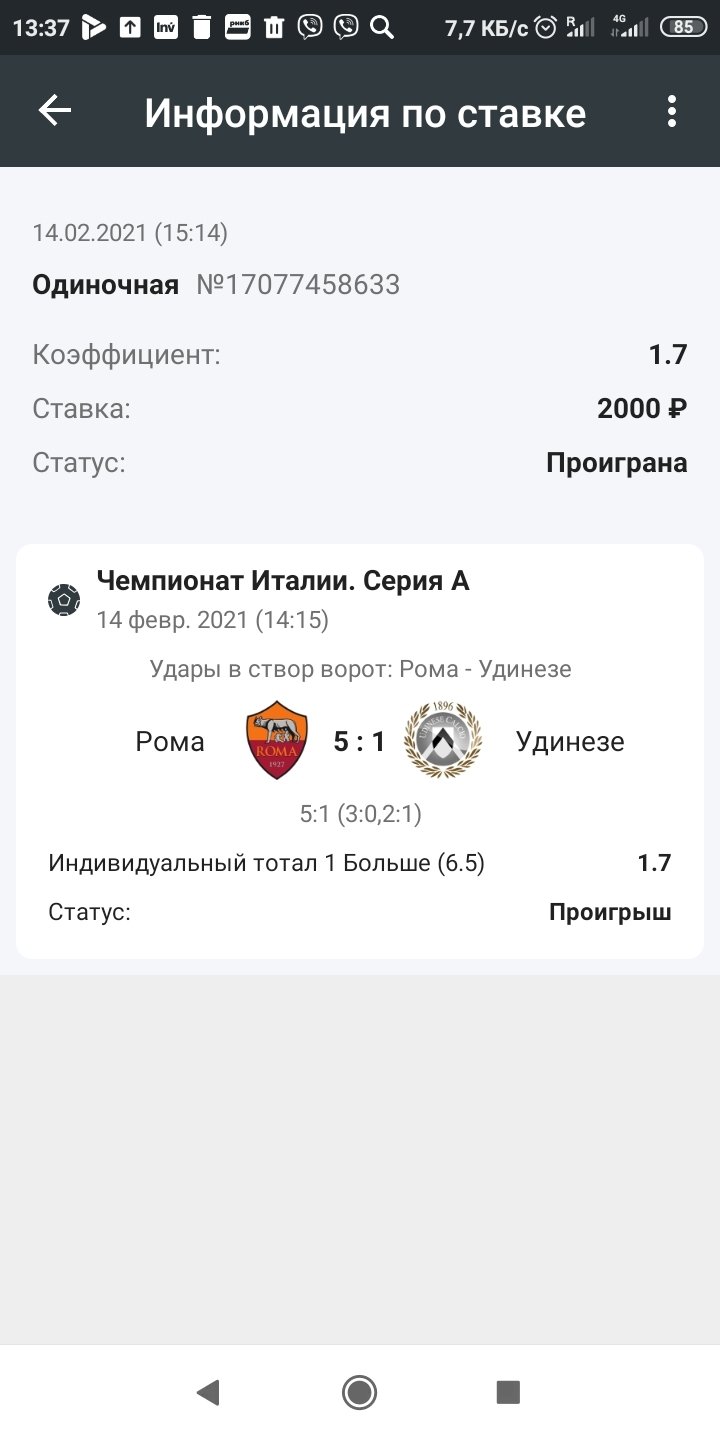 Здравствуйте, матч чемпионата италии Серии А 22 тур Рома - Удинезе, ставка удары в створ ин.т 1 б 6,5. результат матча 8:1 ударов в створ от Ромы это в официальном источнике , контора рассчитала проигрыш с результатом 5:1 . Как решить этот вопрос? Спасибо.