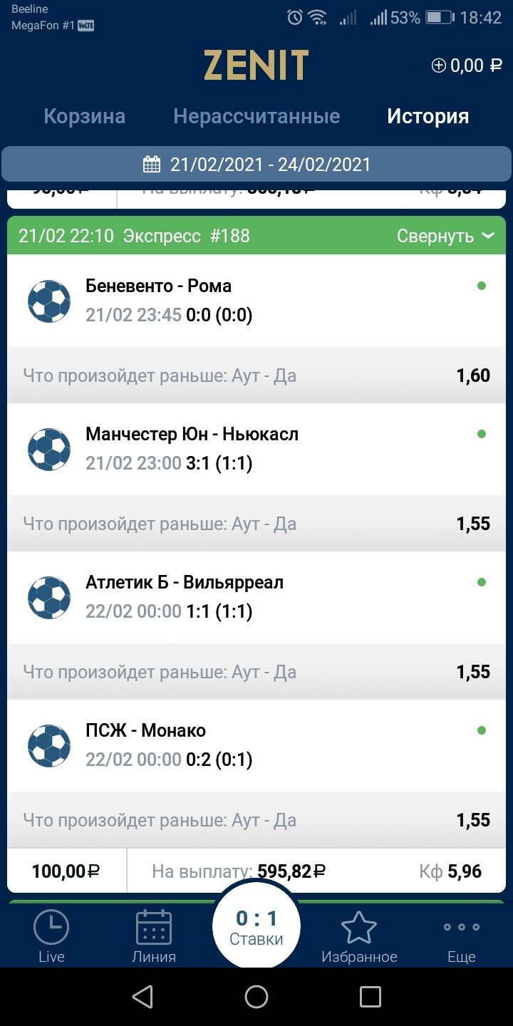 Сделал ставку на первое событие в игре аут в матче Псж-Монако, шла прямая трансляция по федеральному каналу МатчТВ первые два события в игре были ауты на 1 и 2 минуте, но Зенит посчитал что первое событие в игре был гол на 6 минуте