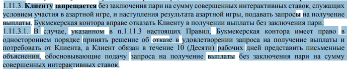 Букмекерская контора вправе отказать Клиенту в получении выплаты без заключения пари и потребовать, а Клиент обязан последовательно проставить сумму интерактивных ставок, но не более 3 (трех) раз (т.е. заключить последовательно несколько пари, но не более трех пари) . При этом коэффициент выигрыша по каждому такому пари должен быть не менее 2.0.