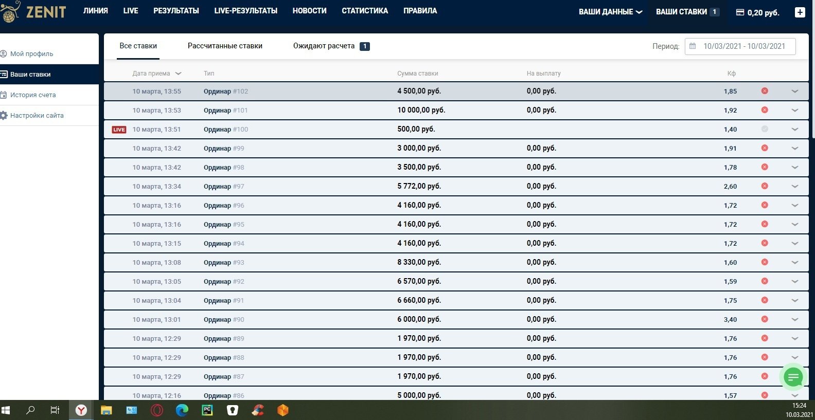 Здравствуйте! Я хотел бы поделиться с вами историей, которая произошла у меня с БК Зенит. Начал играть в этой БК где-то с начала марта, всё поначалу бы нормально: снимали быстро, ставку принимали тоже - в общем всё супер, но до определенного момента... Этот момент наступил вчера-сегодня. Первым делом меня насторожил тот момент, что долго не рассчитывали выигрышную ставку (примерно 2 часа), а также снятие средств находилось в процессе ожидания (хотя, как я упомянул ранее, поначалу всё снималось за считанные минуты). После чего я сделал несколько ставок на аккаунте, немного выиграл и ночью уже создал заявку на вывод средств. Кстати говоря, практически сразу (спустя час) после двухчасового расчета баскетбольного матча заявка была успешно проведена. В итоге на балансе остаётся около 70 тыс. с учётом тех, что находятся в проведении на вывод. После чего, часов с 11 утра на аккаунте я не появлялся, а когда хотел зайти, чтобы проверить баланс, оказалось что я каким-то образом проиграл 17 ставок в ряд. Это какое должно быть невезение у человека, чтобы такое случилось. Заявка на вывод средств была отменена и эти деньги тоже были поставлены на два противоположных исхода одного матча (тб 36.5 и тм 30.5), что собственно нечасто встретишь у обычного игрока. Как такое произошло, не могу себе представить.