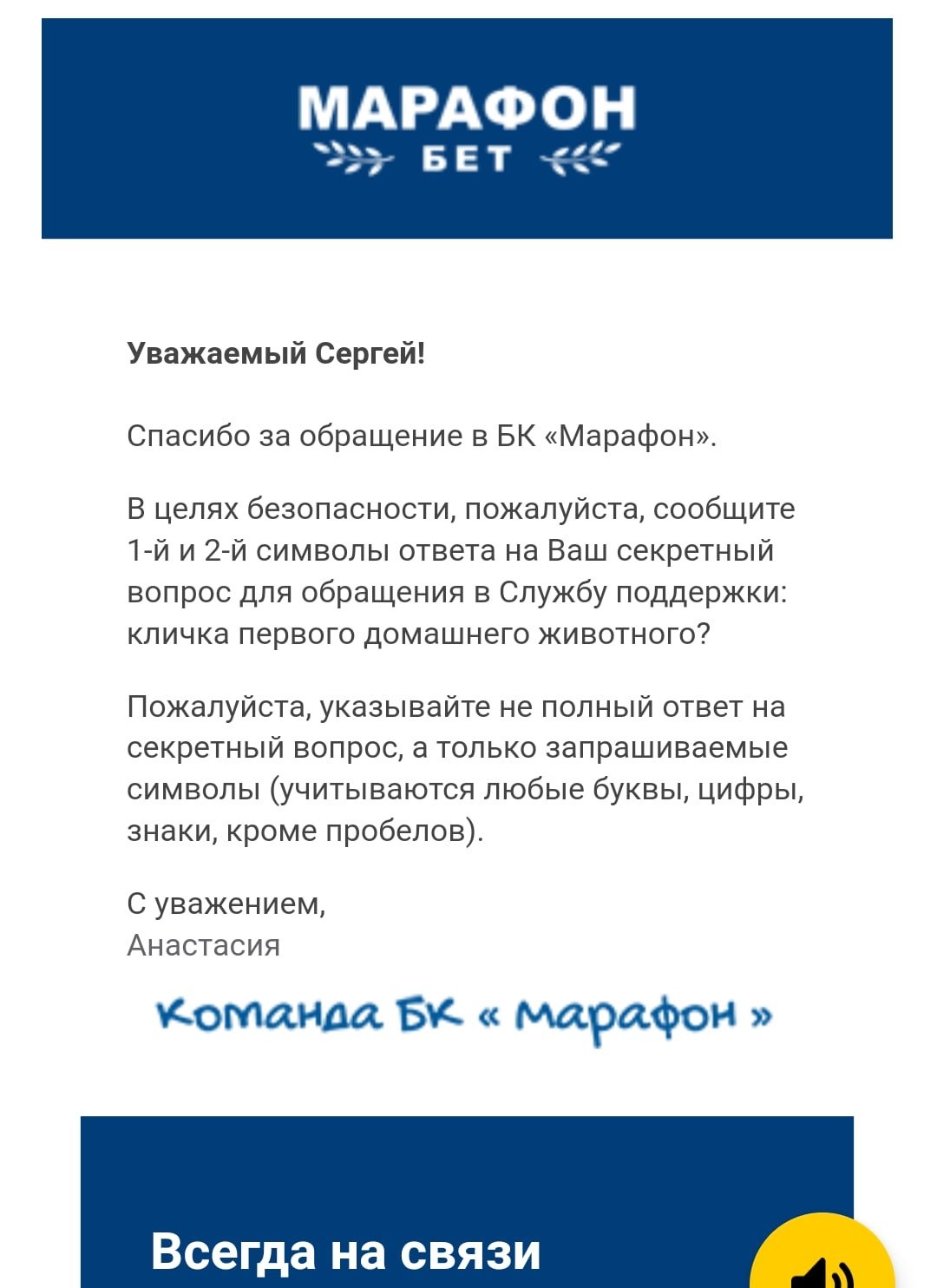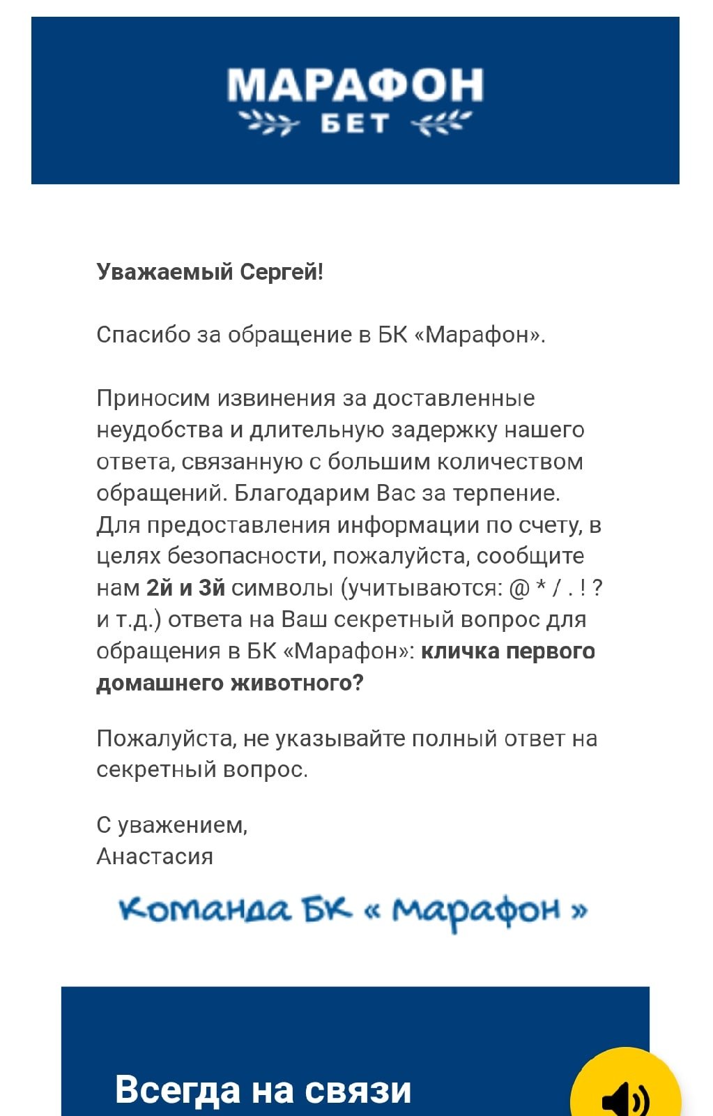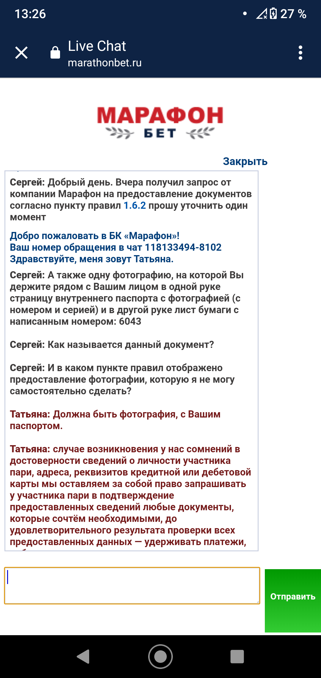 17 марта, БК Марафон запросили у меня 2й и 3й символы... В ответ я отправил им 3й и 4й символы, вместо 2го и 3го