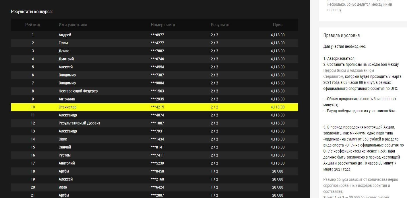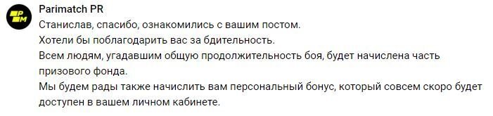 Участвовал в конкурсе прогнозов Париматч, в связи боем Ян-Стерлинг . Необходимо было угадать: — Общую продолжительность боя в минутах; — Раунд победы одного из участников боя. Мои ответы были "19 минут и 4 раунд". (Бой продлился 19:29) В поддержке сказали, что верные ответы "4 минуты и 4 раунд" После моих безответных, но навязчивых обращений - переписали правила и описание конкурса задним числом, но ошибку не признали: теперь там якобы надо было угадать не "общую продолжительность боя", а "продолжительность последнего раунда в минутах". Подробный разбор писал здесь, со скринами и выдержками из правил Контактировать со мной не хотят