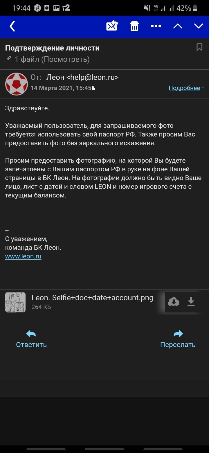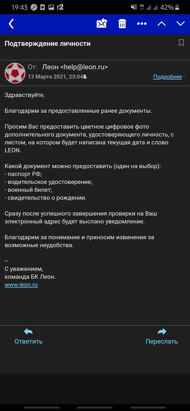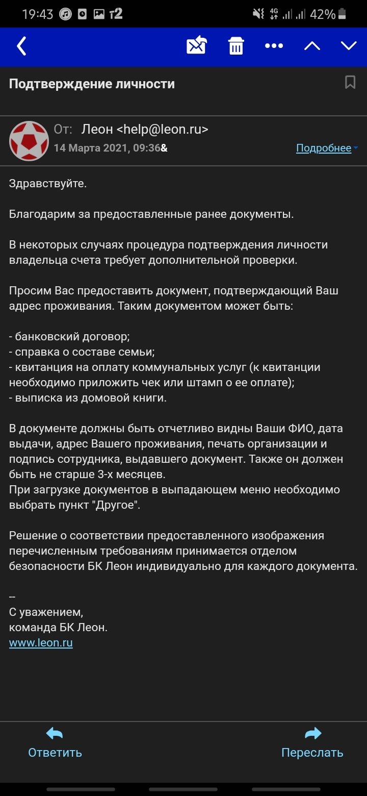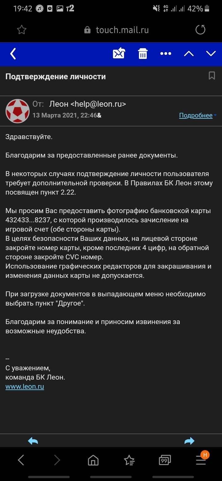 Выйграл тыс руб, когда хотел вывести деньги запросил верификацию, отправил им фото ИНН, загран паспорта со своим фото, датой и названием LEON, затем запросили фото карты с которой пополнял счет отправил, затем запросили доп документ, отправил фото паспорта с датой и названием LEON, запросили договор с банка тоже отправил, сейчас требуют фото мое с паспортом и лецивым счетом, почитав отзывы понял что это будет длиться бесконечно. Прошу помочь в решении вопроса