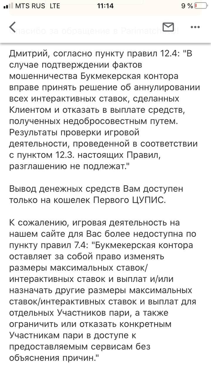 Пару недель назад зарегистрировался на ПариМатч с целью поиграть на Киберфутболе. Знакомый товарищ сказал, что там хорошие коэффициенты и если отслеживать матчи реально поймать игроков в хорошей форме. Начал неудачно - внес на первом этапе 4400. Но удалось поднять банк до 15 тысяч при том, что процентов 70 ставок уходили на проигрыш. Понял, что не мое и решил вывести 10 тысяч. БК заблокировал вывод средств и отправил на видеоверификацию. Прошел ее, но средства все равно не дали вывести, попросил прислать фото-подтверждения, потом квитанцию Отправил все это и продолжил играть на небольшие ставки - уходил до 8 тысяч, возвращался на 13-15. На момент блокировки сумма на счете была 17125 В итоге БК прислал ответ, что мои действия были мошенническими, заблокировал счет, оставив те самые 4400. Хотя не скрываю, что регистрировался только ради киберфутбола, но мог продолжить играть и на другие виды, если бы не блок. Мошенническими действия назвать трудно, учитывая, что проигрывались большие ставки на низкие коэфициенты и так далее. Просьба помочь с возвратом средств