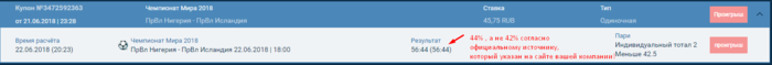 По купону №3472592363 неверно рассчитана ставка. Я ставил на индивидуальный тотал владения мячом Исландия меньше 42,5%. На сайте , который указан источником данных в компании 1xstavka , указан процен 42% , т.е. моя ставка побеждает. В расчете же указано 44% и ставка проиграна. Служба поддержки никак не реагирует. Отправлял им скриншоты и всю информацию. Просто каждый раз пишут, что все рассчитано верно... Обман, не иначе....