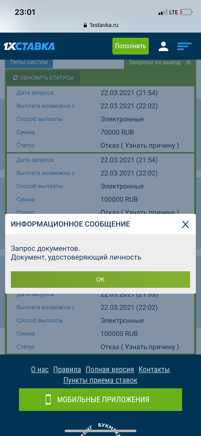 прошел верификацию в отделении букмекера поднял крупную сумму и запросили документы....а верификацию я зачем проходил отправил им фото паспорта и номер счета пока что молчание