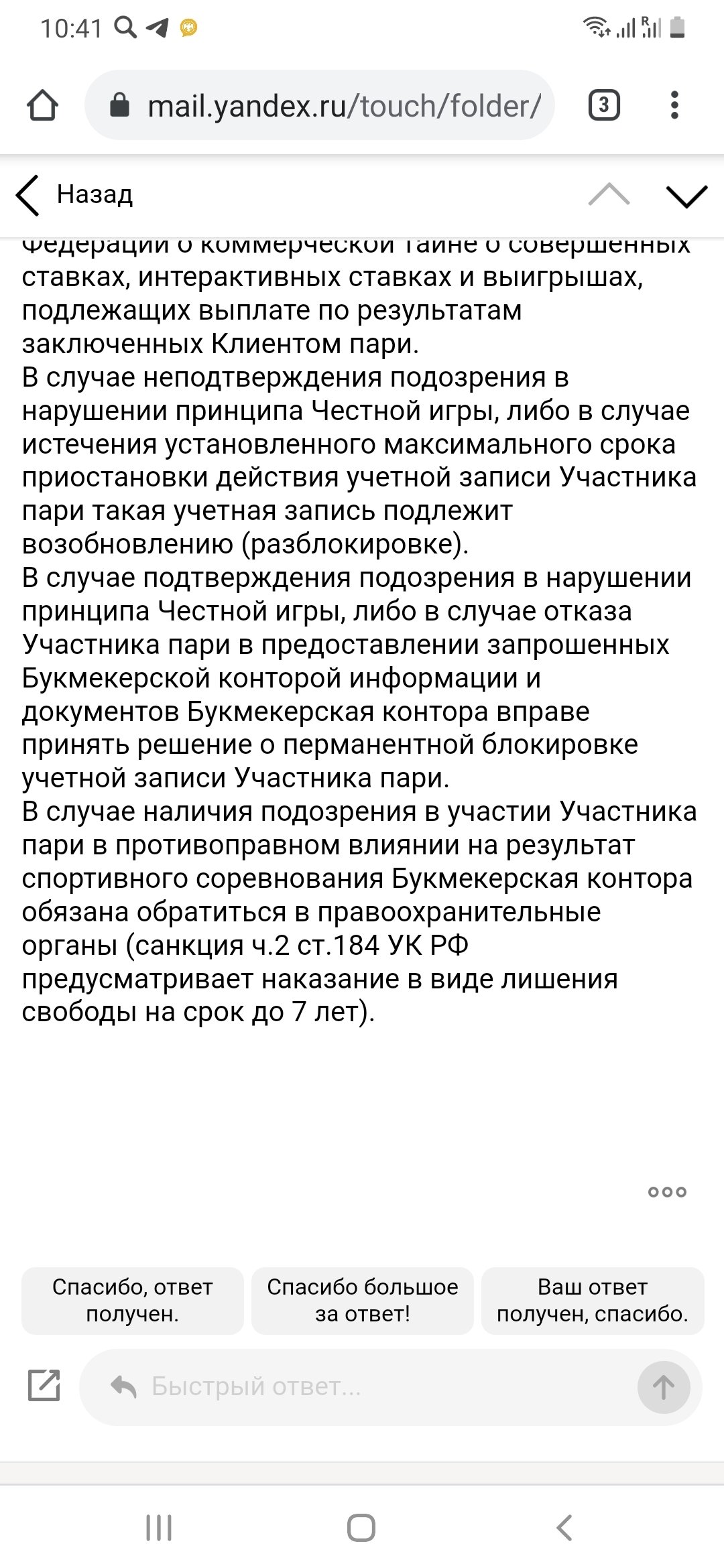 Поступил ответ от СРО. Естественно ответили шаблонно. Легал бет вы можете получить доступ к моим пари , вы можете их изучить и объяснить эти умникам с сро и винлайна что все мои пари что я совершала не находяться нигде под подозрением