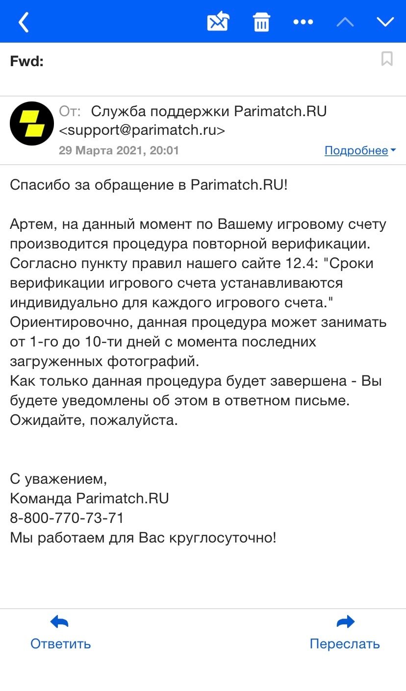 , зарегистрировался и пополнил счёт через ЦУПИС, на Р. Начал играть, поиграл и выиграл р, и сразу же заблокировали счёт и отправили на верификацию. Раньше играл на 1Хставке, в Фонбете, в ППС, решил поиграть онлайн, и тут сразу такая проблемы. Смотрел и выбирал контору по отзывам, и отзывам своих друзей. Контора официальная, а такие большие проблемы.. Отправил им фото паспорта, фотографию с паспортом и табличкой «Для ПариМатч.ру», потом фото паспорта и табличкой «Верификация для ПариМатч.ру», потом попросили квитанцию за Комунальные услуги , это вообще смех.. Но что не сделаешь, ради таких вопросов. Нашёл эту «справку», отправил им. Весь этот процесс уже длится 19 дней, почти 3 недели. И это не нормально, задерживать так выплату денег. Если нужно, отправлю все фотографии с почты, что они у меня просили, сюда не поместились. Надеюсь на вашу помощь! Заранее спасибо Суммы смешные, а они блокируют счёт..