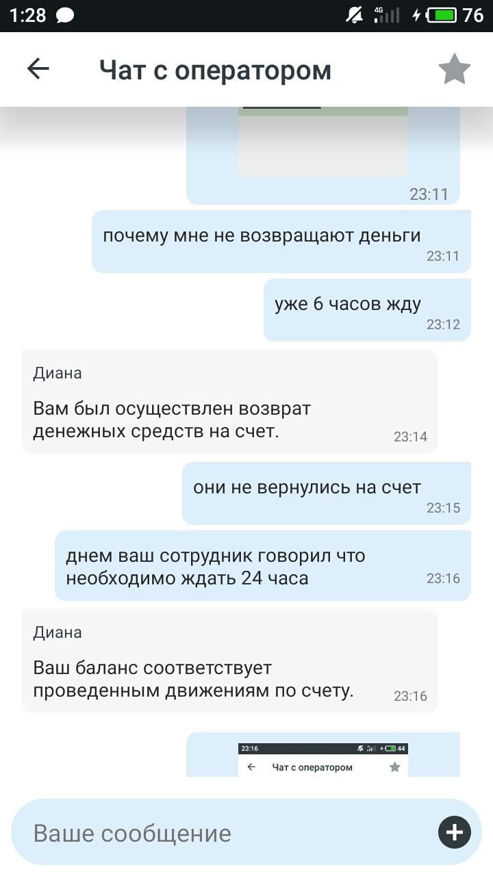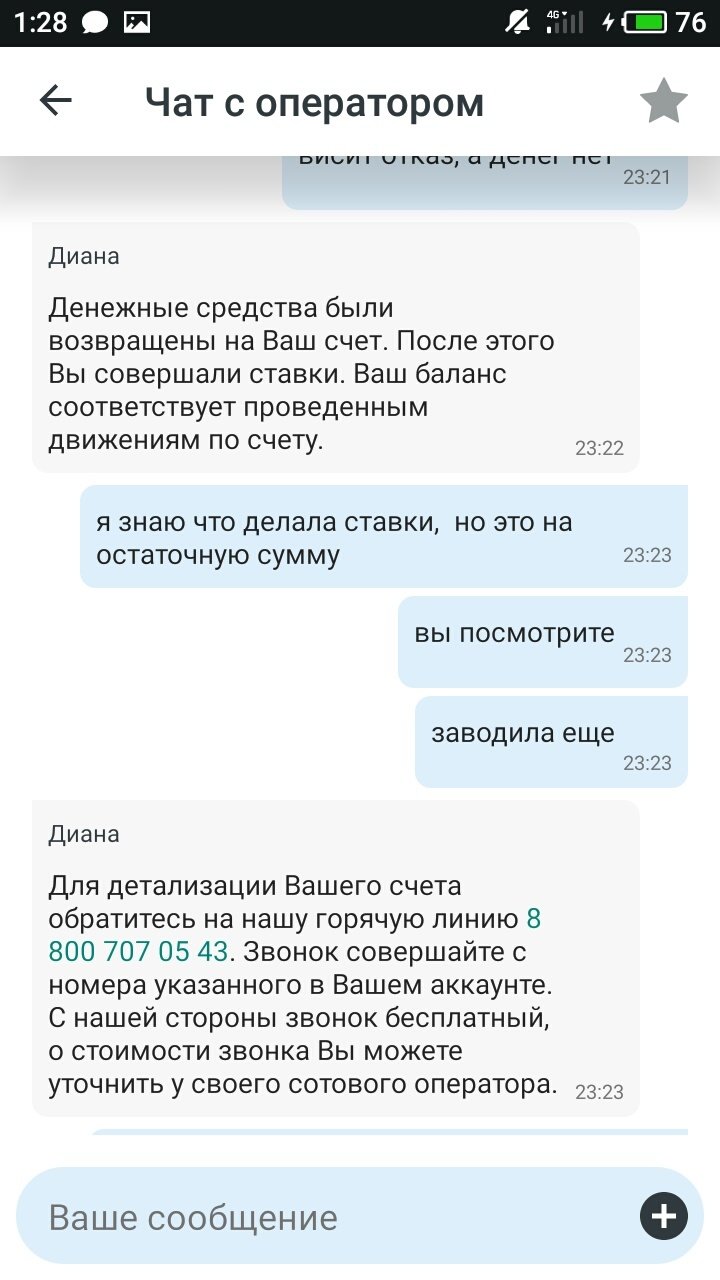 Зарегесрировалась в данной конторе буквально на днях сразу получилось выиграть денег, ставлю на вывод 7000р мне пишут отказ попробуйте позднее, при этом обратно на счет деньги не возвращают, пишу в поддержку, типа в почему так? Мне говорят ожидайте 24 часа, позже пишу почему так долго, мне уже другой консультант пишет что все средства вернули и вы их проиграли, бред полный, пытаюсь объяснить что это не возможно там даже проигрешей на эту сумму нет и вообще даже в истории операций не отабажено что средства вернули, мне говорят звонить в горячую линию и т. д.