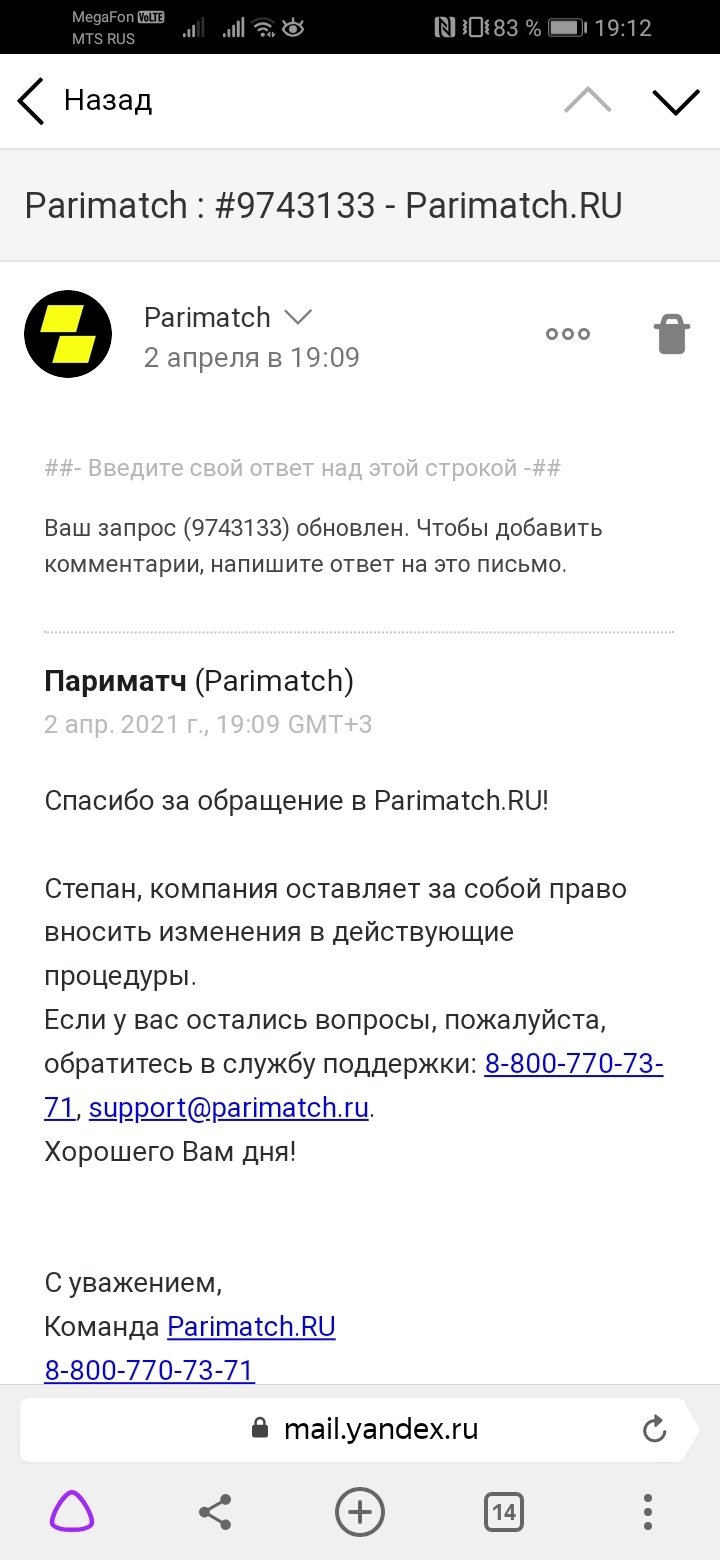 Здравствуйте, я являюсь клиентом букмекерской конторы париматч более трех лет, наверно как вы знаете у них есть акция по компенсации налога, я получил данную компенсацию за 2018, 2019 года, но вот при получении компенсации за 2020 год - я столкнулся с проблемами, позвонив на горячую линию оператор озвучил мне, что данная акция действует и он передал информацию в профильный отдел, чуть позже мне пришло письмо на почту о необходимости предоставить скриншоты с личного кабинета налогоплательщика, я предоставил скриншоты и стал ждать, по итогу я получил письмо о том что в предоставлении акции мне отказано, я попытался уточнить по какой причине я получил отказ, но вразумительного ответа я так и не получил, кроме слов, что данная акция является проявлением лояльности компании и назначается по решению администрации. По итогу я потратил свое время и получил отказ, так же хочу отметить, что данная букмекерская контора полностью лишила меня всех акций по непонятной для меня причине