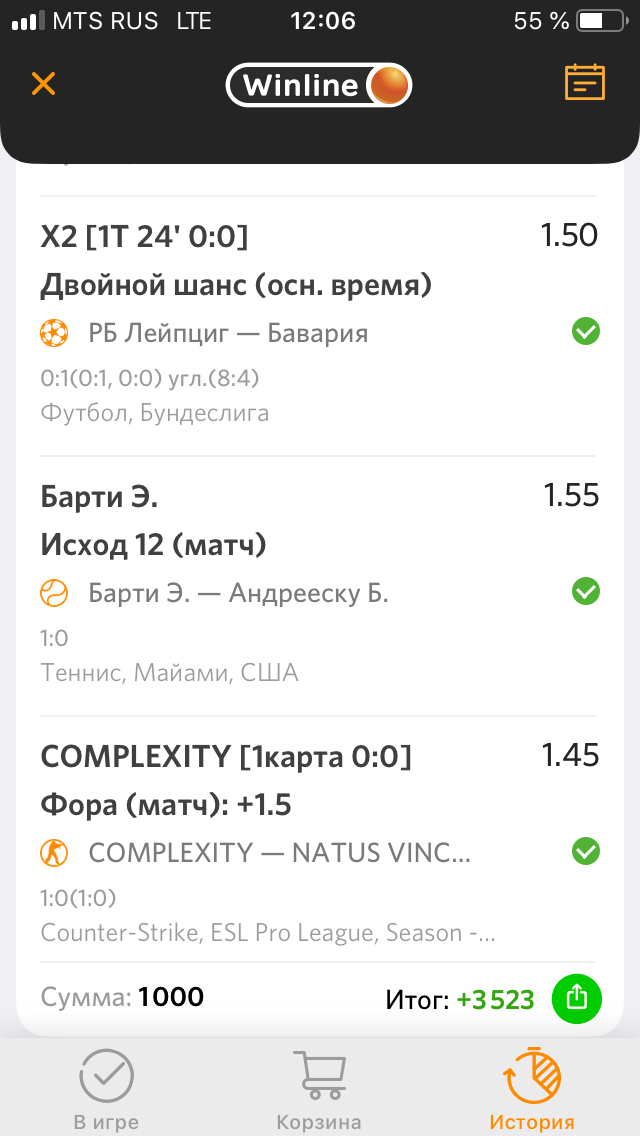 Сделал ставку на 1000 р с кефом ,выйгрышь составил 3523,как я понял теннисный матч который закончился отказом теннесистки которая проигрывала 6-3,4-0 и смирилась с поражением отказавшись играть дальше,расчитали возвратом.Но это грабеж,исход этого матча был предрешен и ставка бы сыграла и с отказом и без отказа. В любых нормальных ббк возврат делают только если еще не закончился первый сет.