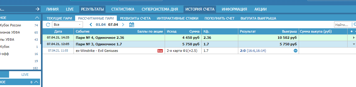 Ставил киберспорт матч ex-Winstrike - Evil Geniuses 2-я карта Ф1(+2.5) кэф 1.7 сумма 5750 по итогу карты счет был 16:14 соответственно ставка выиграла и была рассчитана выигрышем, но через несколько часов недосчитался баланса на счете, как оказалось ставку рассчитали возвратом. Какого черта происходит? Если бы ставка проиграла ее никогда бы так не рассчитали, вот что значит бк в России как хочу так и рассчитаю. А еще пишут на сайте 17 лет на рынке понятно, как работает данная бк.