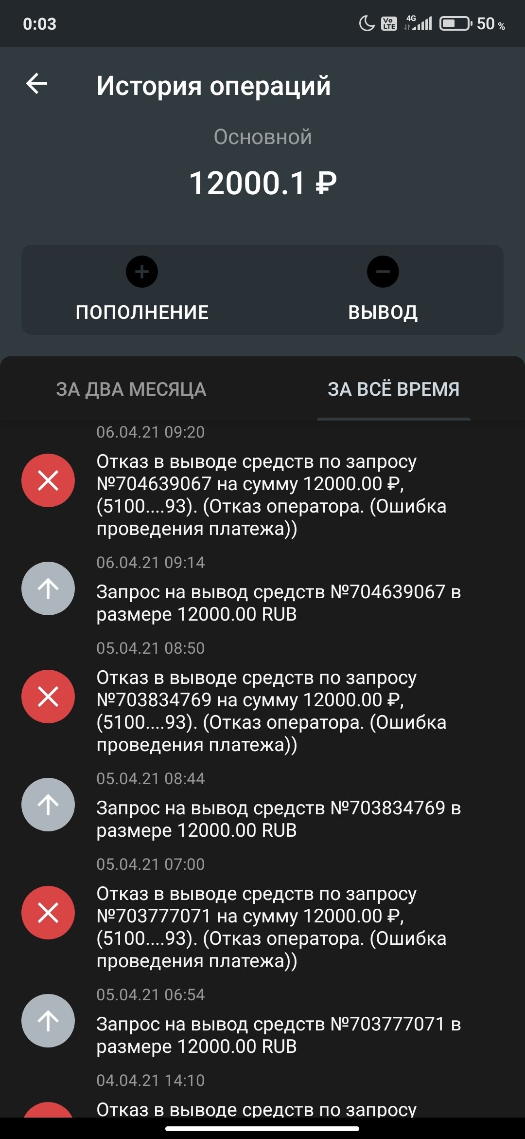 Не могу вывести средства, даже свои, пишет отказ оператора. Звонил в техподдержку, говорят помочь не могут и бросают трубку. Уже не знаю куда обращаться. Помогите пожалуйста