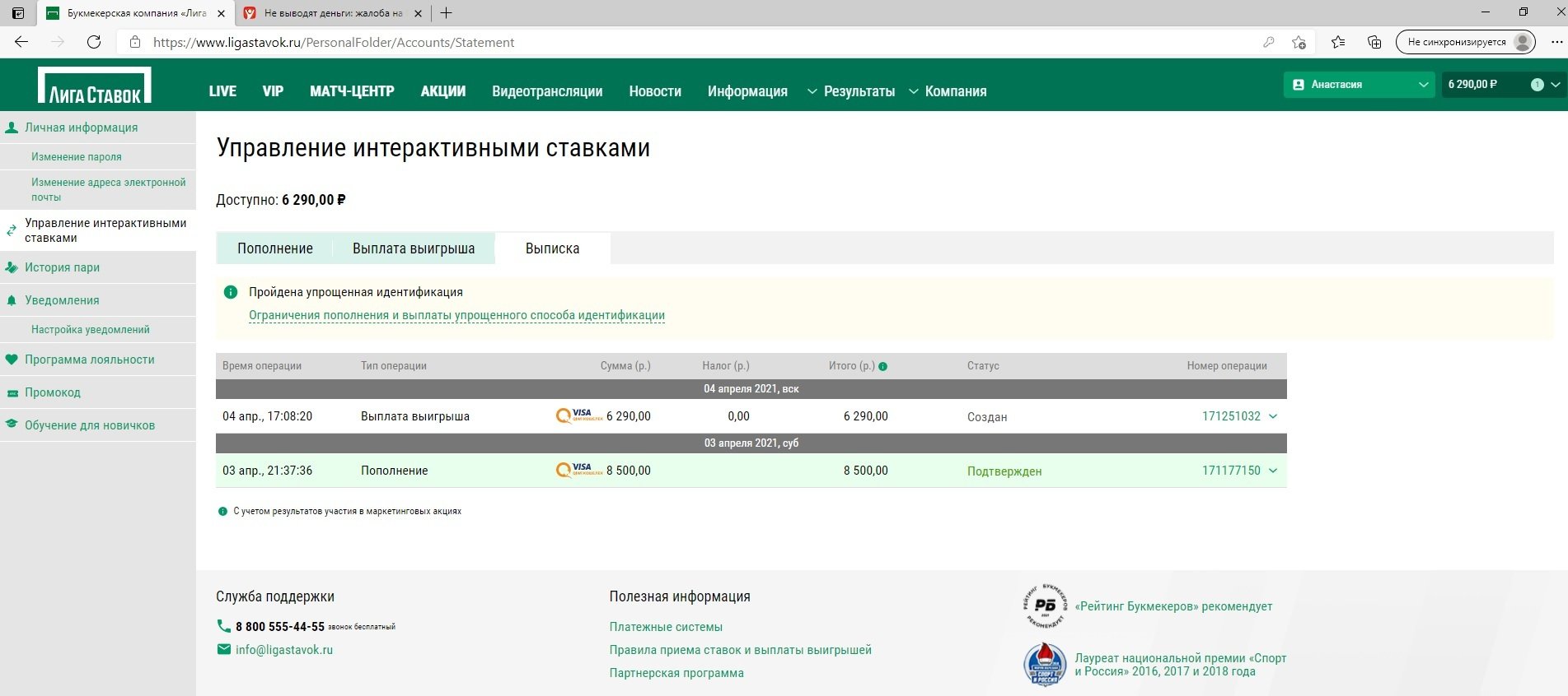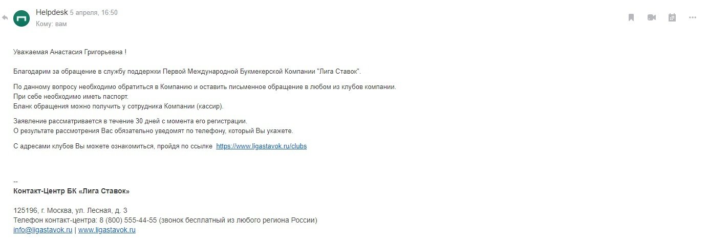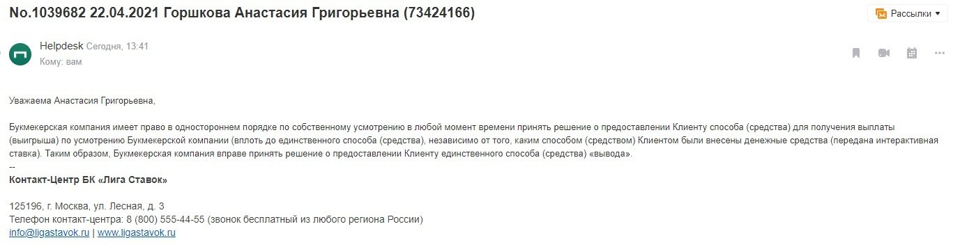 Здравствуйте, зарегистрировалась в конторе, пополнила счет на 8500 руб, сделала ставку, она зашла, баланс стал 14790, сделала еще одну ставку на 8500 руб, она не зашла, баланс стал 6290, отправила на вывод 04 апр., 17:08:20 статус по сегодняшний день до сих пор" Создан " В службе поддержки говорят приходите в клуб, пишите заявление, я живу в поселке и у на клуба лиги ставок нет, поехать в ближайший город я не могу, так как у меня несовершеннолетняя дочь! Деньги я вывожу на тот же кошелек с которого пополняла, помогите мне пожалуйста!!!