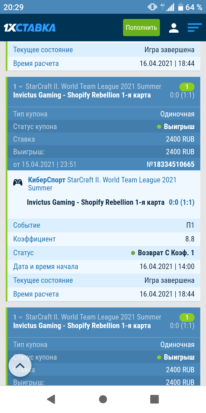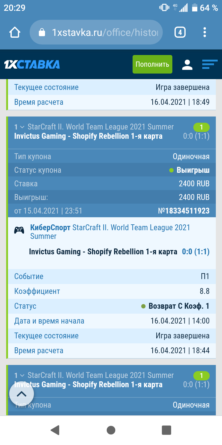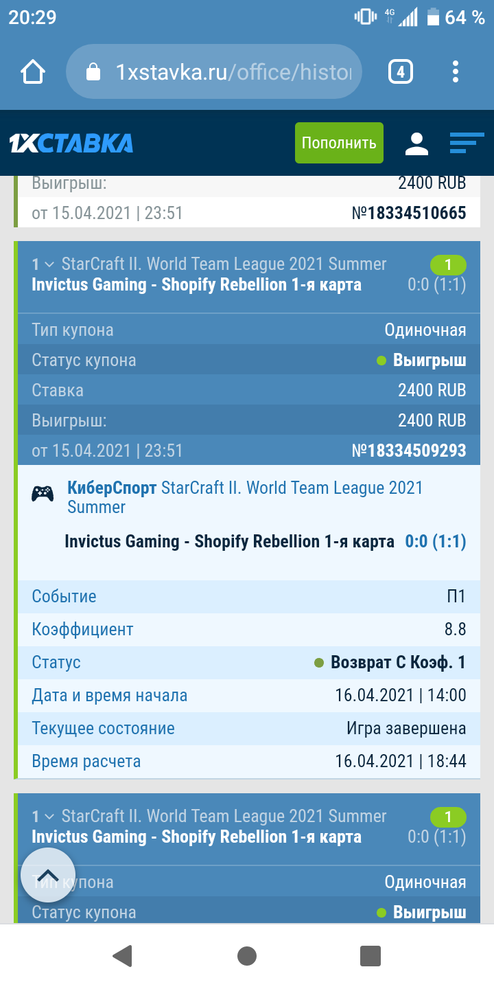 Здравствуйте. Букмекерская контора 1xstavka сделала возврат там где возврата быть не может в принципе. Мною было сделано 4 ставки на турнир World Team League 2021 Summer Regular Seasonпо кибер дисциплине Starcraft 2 Ставки были сделаны примерно за 14 часов до начала события.Событие: матч команд Invictus Gaming и Shopify Rebellious в 14:00 по МСК.Ставки были одинаковыеСумма каждой 2400Коэффициент 8.8На победу команды Invictus Gaming на первой карте. Должен сказать, что я часто ставлю по несколько ставок на одно событие так как лимиты низкие. Обычно я добираю примерно до 15 тыс. В этот раз поставил даже меньше, так как было страшновато ставить много на явного аутсайдера, но коэффициент был хороший, поэтому поставил 9600 в сумме четырёх ставок. Ставка выиграла. Тому есть подтверждения:1. Запись прямого эфира на стриминговой платформе Twitch.Запись игры интересующей нас карты начинается на 17:50 минуте трансляции и заканчивается на 33:50 минуте. Игрок команды Shopify Rebellion, пишет GG и выходит из игры, тем самым признавая поражение. Команда Invictus Gaming побеждает на первой карте:// Страница турнира как минимум на двух разных сайтах.Ссылку с ликипедии смотрите выше.По умолчанию подробности там свёрнуты. Для того чтобы их развернуть нужно нажать на кнопку [show] и потом на кнопку [+maps]. Вот ещё один сайтВозможно для правильного отображения данной страницы лучше смотреть её в режиме для ПК. Также вкладываю поясняющие скриншоты с этих сайтов. На первом скриншоте я жирно обвёл красным маркером ту карту, на которую совершил ставки. Второй скриншот иллюстрирует результат на сайте ликипедия. Карта также обведена красным. Победитель указан зелёной галочкой. Обратите внимание, что у карты результат может быть лишь п1 и п2. Ничья не возможна. Собственно среди вариантов ставок в линии на это событие она и не была предложена. Было только п1 и п2.Но каково же было мое удивление когда 1xstavka сделали возврат и написали в купоне результат 1:1Скриншоты прилагаю. На третьем скриншоте результат после сыгранной первой карты, показанный во время трансляции. Я сразу понял какая ошибка возникла. Дело в том, что по правилам турнира от каждой команды выставляется три игрока. И получается три пары. Каждая пара играет две карты. То есть всего шесть. Если после этого счёт 3:3, то играется Эйс. Первая пара тоже естественно играла две карты. Общий счёт ДВУХ карт действительно 1:1. Но в моём купоне написано, что это ставка на КАРТУ 1. А она как видно из скриншотов была выиграна командой Invictus Gaming Я обратился в поддержку. Там мне сказали, что счёт карты 1:1 и потому возврат. Но у карты такого счёта быть не может. Это счёт ДВУХ карт, а не одной. После длительной переписки, они ответили, что мое обращение в работе и они со мной свяжутся. Прошло уже 5 дней, а они молчат. На мои письма отвечают шаблонно. Как я полагаю, они тянут время, чтобы прошло какое то количество контрольных дней и можно было бы на законных основаниях оставить мое обращение без ответа, так как я не оформил жалобу официально. А переписка не считается официальным общением. Номера ставок18334511923 18334510665 18334509293 18334507421 Более трех скриншотов тут не умещается. Поэтому скрины самих купонов не влезли.И ещё постскриптум. Я при просмотре стримов общаюсь с другими людьми, а также в тематических группах. Один человек написал, что делал такую же точно ставку у букмекера pinup. Так вот там ему рассчитали как выигрыш. Я, к сожален