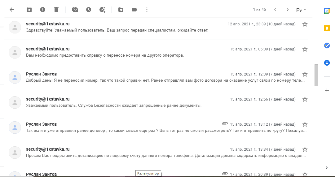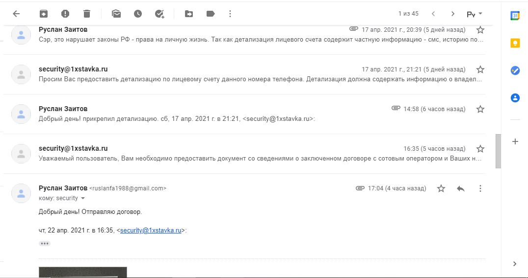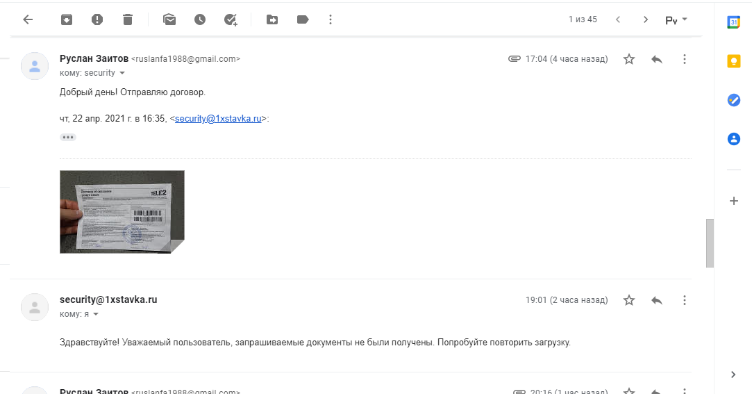 Добрый день! Букмекер 1хставка затягивают процесс верификации, уже больше месяца я шлю им различные документы, чтобы только подтвердить владение номером телефона. На почте накопилась огромная цепочка из 23 писем с ними. Я думаю, что они просто не хотят платить, и так и гоняют "по кругу" с разными документами. Так, сначала запросили договор на оказание услуг связи по номеру телефона, я его предоставил. Тогда запросили выписку по киви-кошельку, зарегистрированному на этот номер - отправил. Далее они просят выслать справку о переносе номера на другого оператора. При том что, я не могу никак дать им такой справки, ибо номер никогда не переносился, он как был , так и остался на операторе теле2 и они сами это должны понимать, т.к. даже если попробовать ввести этот номер в любом приложении интернет-банкинга с целью пополнить счет - там покажет оператора теле2. Тогда они запросили договор снова (второй раз!!!!), смотрите на скриншоте их сообщение "Уважаемый пользователь, Служба Безопасности ожидает запрошенные ранее документы." Видно, у них фантазия кончилась. После этого я еще отправлял детализацию по номеру, а запрашивать подобные документы вообще-то нарушает законодательство РФ - а конкретно права на личную жизнь. Так как детализация лицевого счета содержит частную информацию: смс, историю пополнений, звонки другим абонентам и тд. 1хставка - легальный букмекер, и они должны это понимать. Это стало последней каплей и я решил, что пора обращаться в соответствующие инстанции. Теперь Служба безопасности ответили мне следующее: "Уважаемый пользователь, Вам необходимо предоставить документ со сведениями о заключенном договоре с сотовым оператором и Ваших номерах. Для этого Вам необходимо обратиться в офис Вашего сотового оператора. Документ должен быть заверен подписью и печатью." Добрый день! Букмекер 1хставка затягивают процесс верификации, уже больше месяца я шлю им различные документы, чтобы только подтвердить владение номером телефона. На почте накопилась огромная цепочка из 23 писем с ними. Я думаю, что они просто не хотят платить, и так и гоняют "по кругу" с разными документами. Так, сначала запросили договор на оказание услуг связи по номеру телефона, я его предоставил. Тогда запросили выписку по киви-кошельку, зарегистрированному на этот номер - отправил. Далее они просят выслать справку о переносе номера на другого оператора. При том что, я не могу никак дать им такой справки, ибо номер никогда не переносился, он как был , так и остался на операторе теле2 и они сами это должны понимать, т.к. даже если попробовать ввести этот номер в любом приложении интернет-банкинга с целью пополнить счет - там покажет оператора теле2. Тогда они запросили договор снова (второй раз!!!!), смотрите на скриншоте их сообщение "Уважаемый пользователь, Служба Безопасности ожидает запрошенные ранее документы." Видно, у них фантазия кончилась. После этого я еще отправлял детализацию по номеру, а запрашивать подобные документы вообще-то нарушает законодательство РФ - а конкретно права на личную жизнь. Так как детализация лицевого счета содержит частную информацию: смс, историю пополнений, звонки другим абонентам и тд. 1хставка - легальный букмекер, и они должны это понимать. Это стало последней каплей и я решил, что пора обращаться в соответствующие инстанции. Теперь Служб
