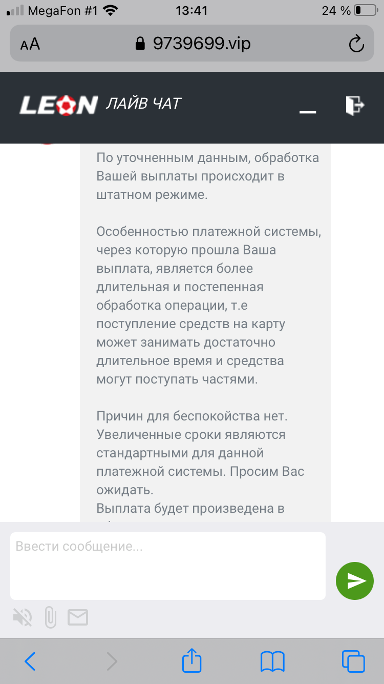 Играю на бк леон достаточно давно, всегда все было нормально , но потом начали чудить. Для начала была ситуация с отменой моего пари, которое было выиграно мной честным образом, но бк леон сослался на их ошибку программы(или что-то в этом духе) и, в общем, мне не вернули не сумму ставки, не выигрыш соответственно. Но проблема не в этом, да и доказательства искать попросту лень. Сейчас же ситуация следующая. Запросил выплату выигрыша 18000₽(I’d 288146350) 19 апреля в , он был в обработке, потом его отменили. далее запросил выплату 9000₽ (Id 288162553), запрос провисел два дня в ожидании и после моих бесконечных сообщений все же деньги вернулись мне на счёт бк. Теперь же запросил две выплаты в 5000₽ (288330284) И 4000₽ (288331552) история та же, платежи в обработке и так же никаких действий. Хочу получить свои деньги на карту . Помогите.