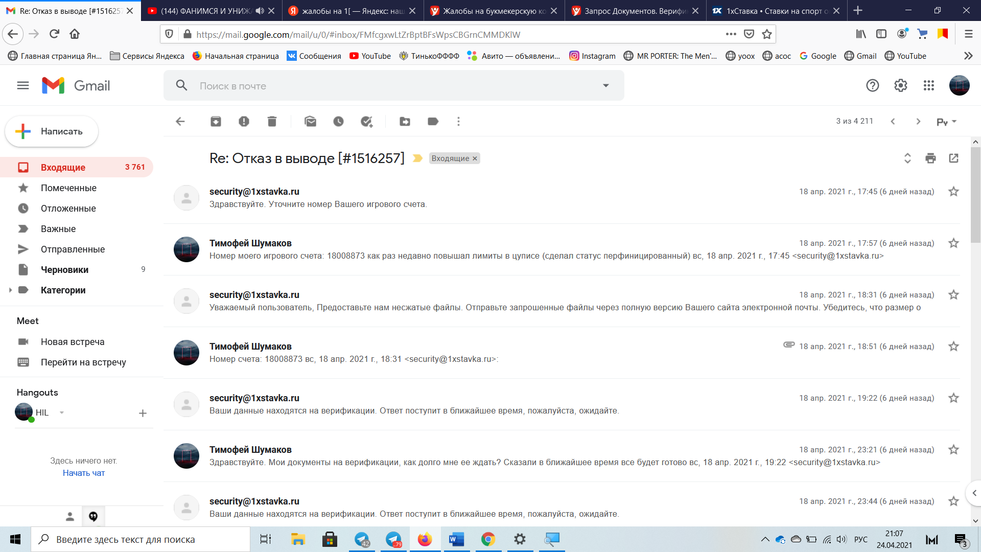Здраствуйте, портал LegalBet! Мой ID: 18008873, Шумаков Тимофей Евгеньевич. Верификация длится уже неделю, при этом я уже предоставил полный пакет документов. А именно: паспортные данные (их фото), фото карты с двух сторон на фоне переписки со службой безопасности, фото карты с паспортом и своим лицом (держал в руках), далее выписку по счету из банка (в формате ПДФ с печатью и подписью сотрудника банка), далее я отправил им фото себя с паспортом в руках на фоне переписки со службой безопасности. Все было сделано в разных ракурсах и в хорошем качестве (порядком 15 фото в разных ракурсах и с разными фонами). Букмекерская контора продолжает тянуть время с последующим ожиданием. Приходил в ППС, звонил на горячую линию, ничем помочь не смогли. Будьте добры, поспособствуйте ускорению процесса, пожалуйста (так как на счете в данный момент 45298р.) P.S. На аккаунте пройдена максимальная верификация в ЦУПИС (через ППС 1хставка) и применена 2-х факторная индетификация на аккаунте.