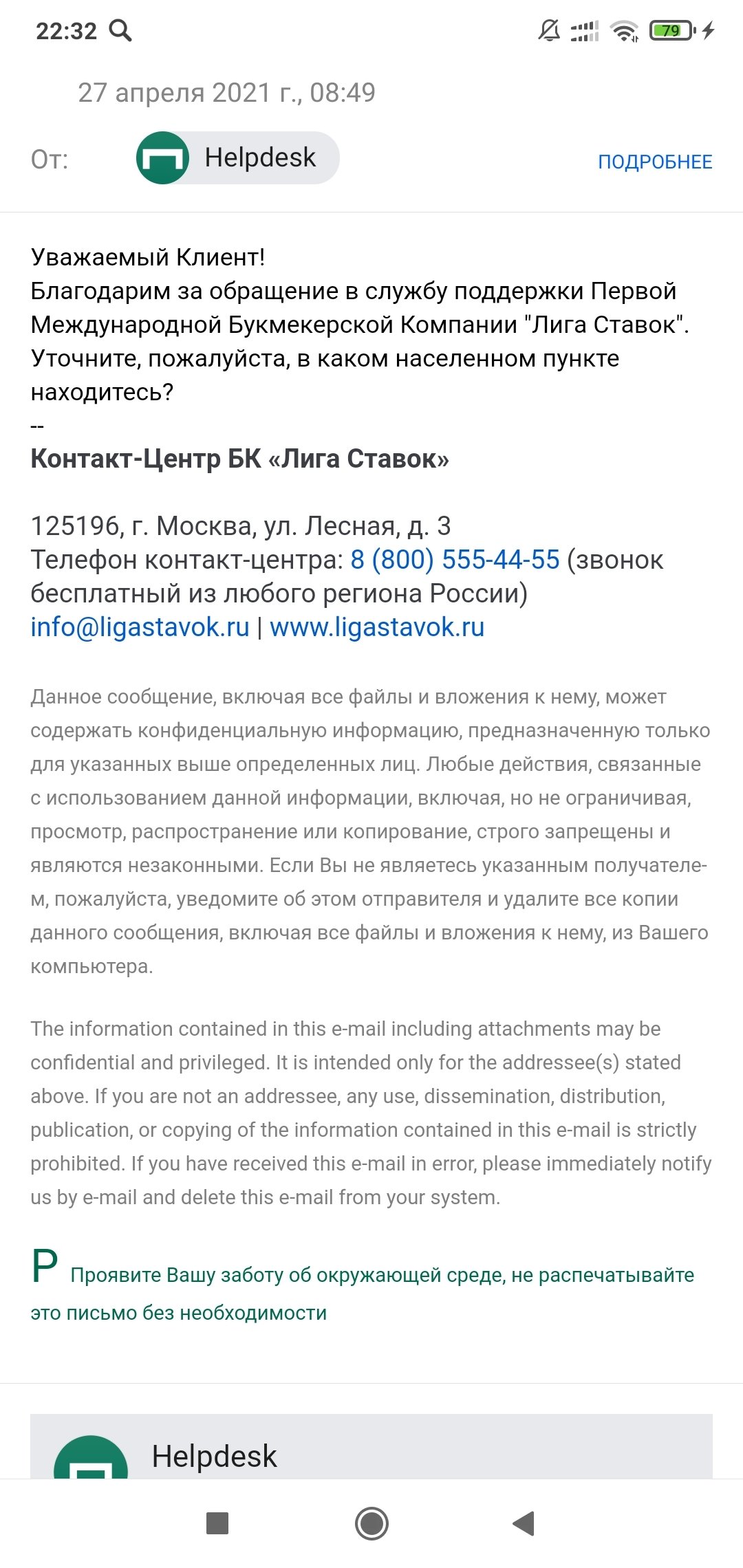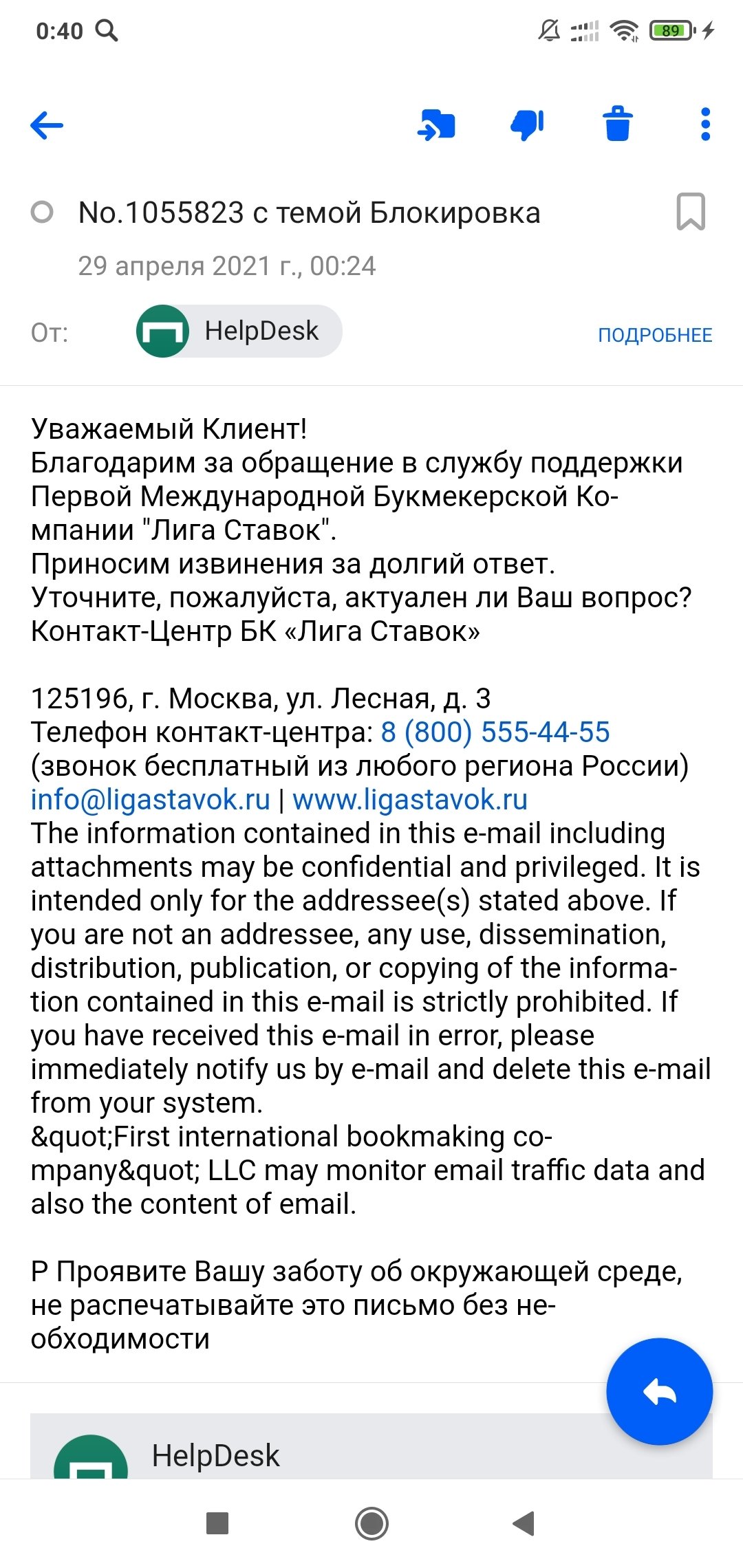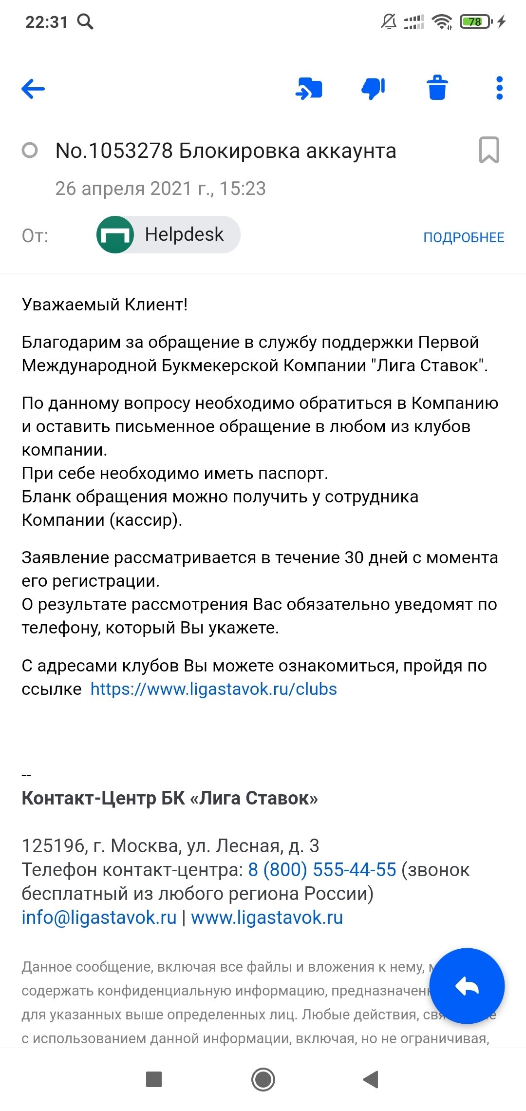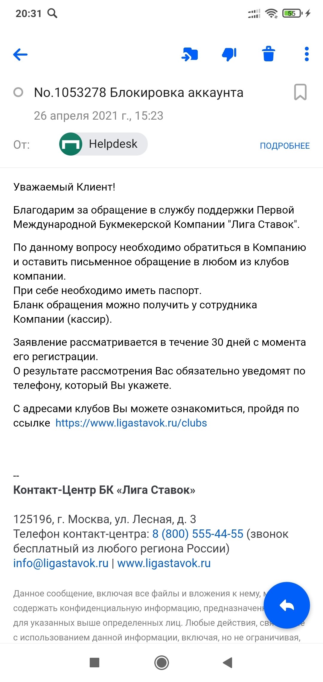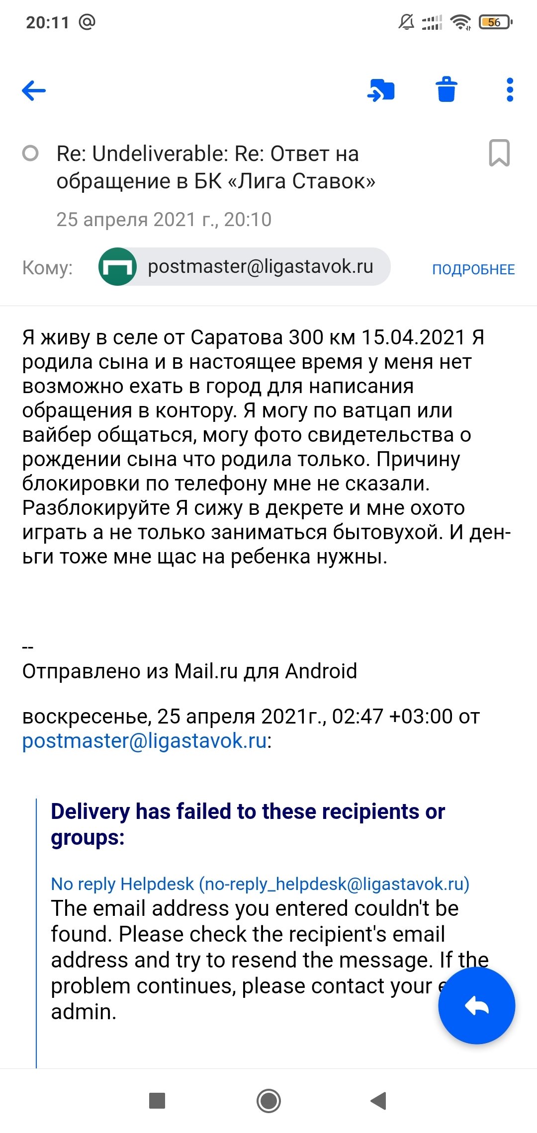 Отправляйте на адрес поддержки info@ligastavok.ru, а не почтовому роботу.