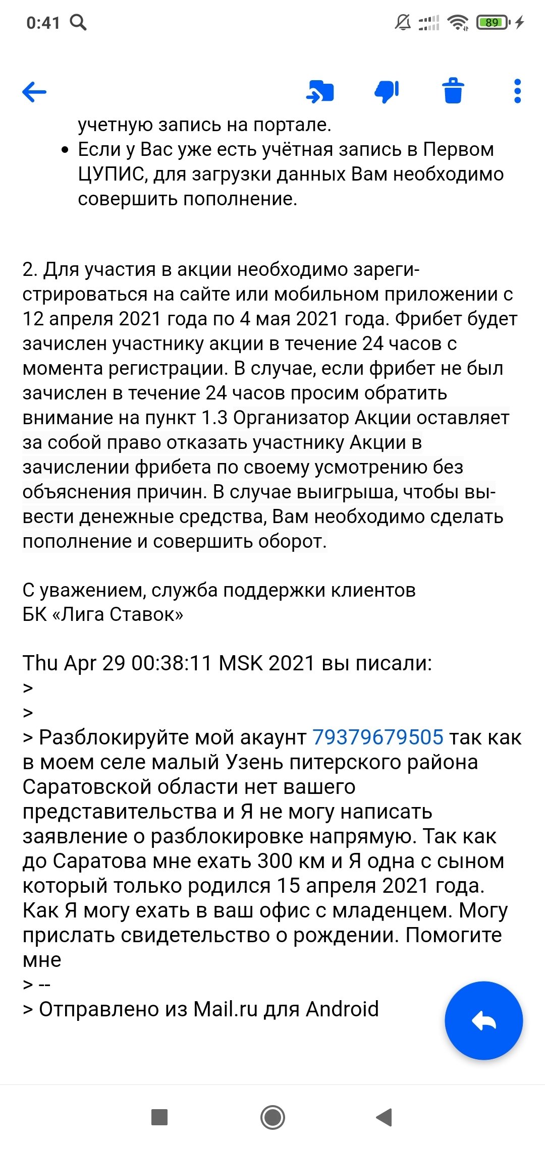 Я живу в селе от Саратова 300 км 15.04.2021 Я родила сына и в настоящее время у меня нет возможно ехать в город. Я написала на почту лига ставок и звонила им но никакого положительного решения. Причину блокировки по телефону мне не сказали.
