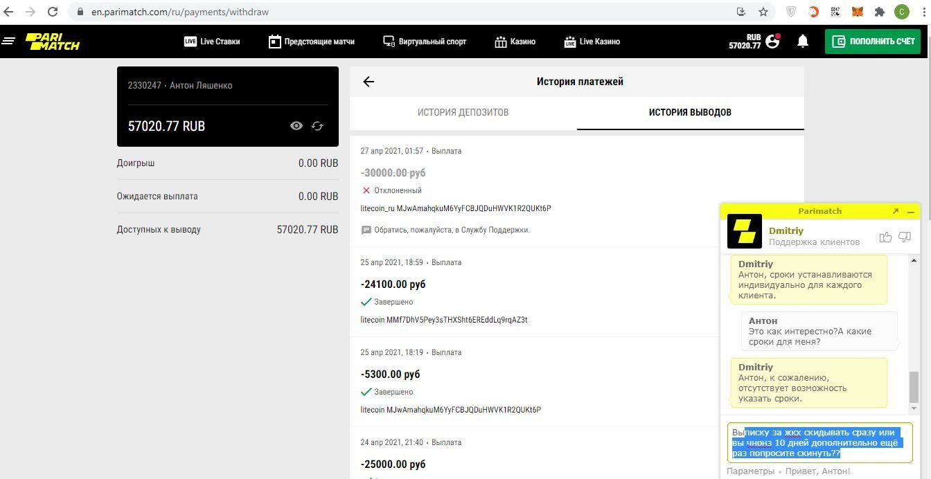 Добрый день.Клиентом пари матча являюсь с 2015 года.За это время ранее не было ни каких проблем с выводом.Но вот решил пополнить счет с лайткоина и поиграть по лайву.С 22 тысяч наиграл до 57 и решил частично снять 30 000 рублей.Через несколько минут деньги вернулись обратно и появилась надпись что сейчас вывод недоступен ,напишите в поддержку.В поддержка сказали то нужна верефикация.Сегодня утром все отправил и позвонил на гарячую линию.Спросил сколько ждать проверки и так и не получил внятного ответа.В чате поддержки тоже самое.Являюсь довольно давним игрокам и имею аккаунты и в марафоне и в других бк.Знаю что в основном проверка проходит в течении суток.Но почитав данные жалобы людей с той же проблемой что и у меня я понял что можно сразу оставлять жалобу.Как раз надо платить по кредиту и тут такая засада.Очень разочарован данным бк.До этого за 6 лет не было проблем.И да и то что я выиграл это капля в море по сравнению сколько проигранно за это время.Просьба посодействовать решению вопроса! Мой игровой счет 2330247